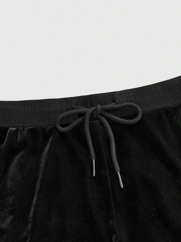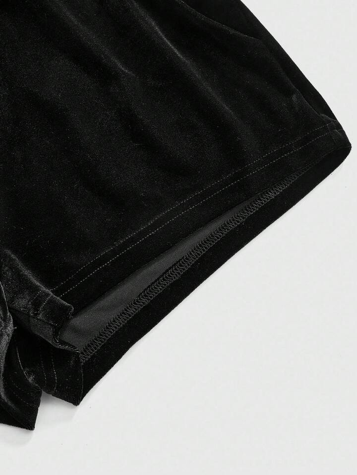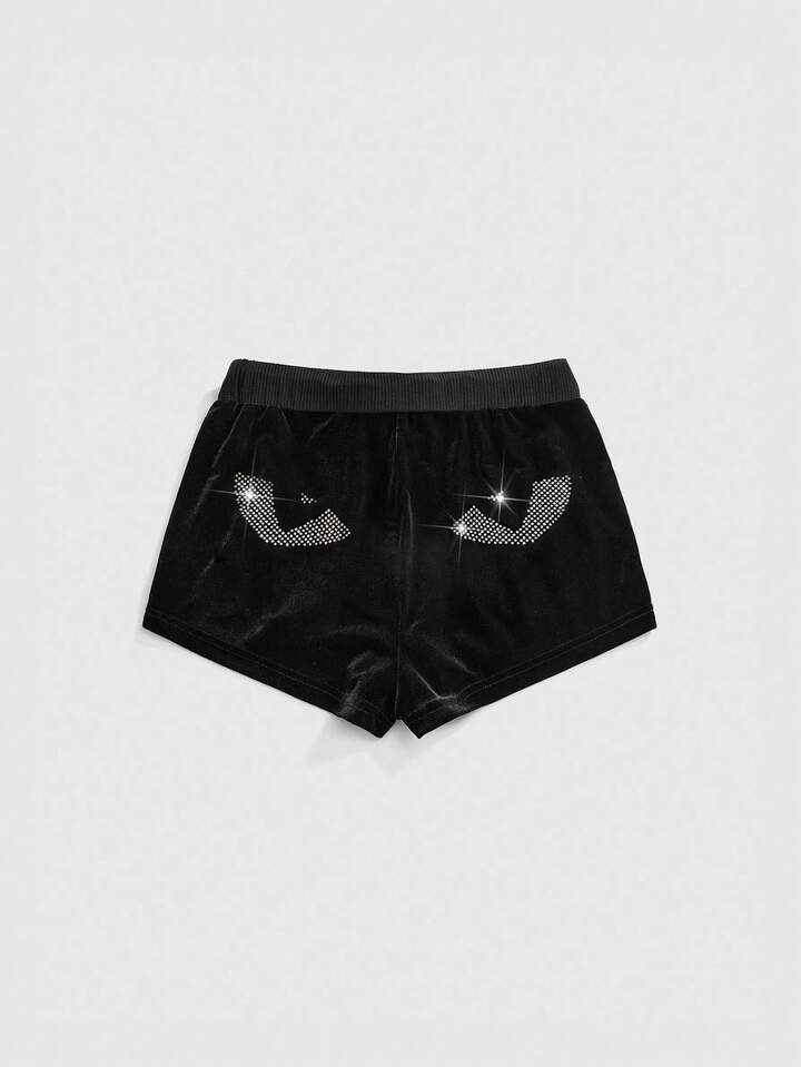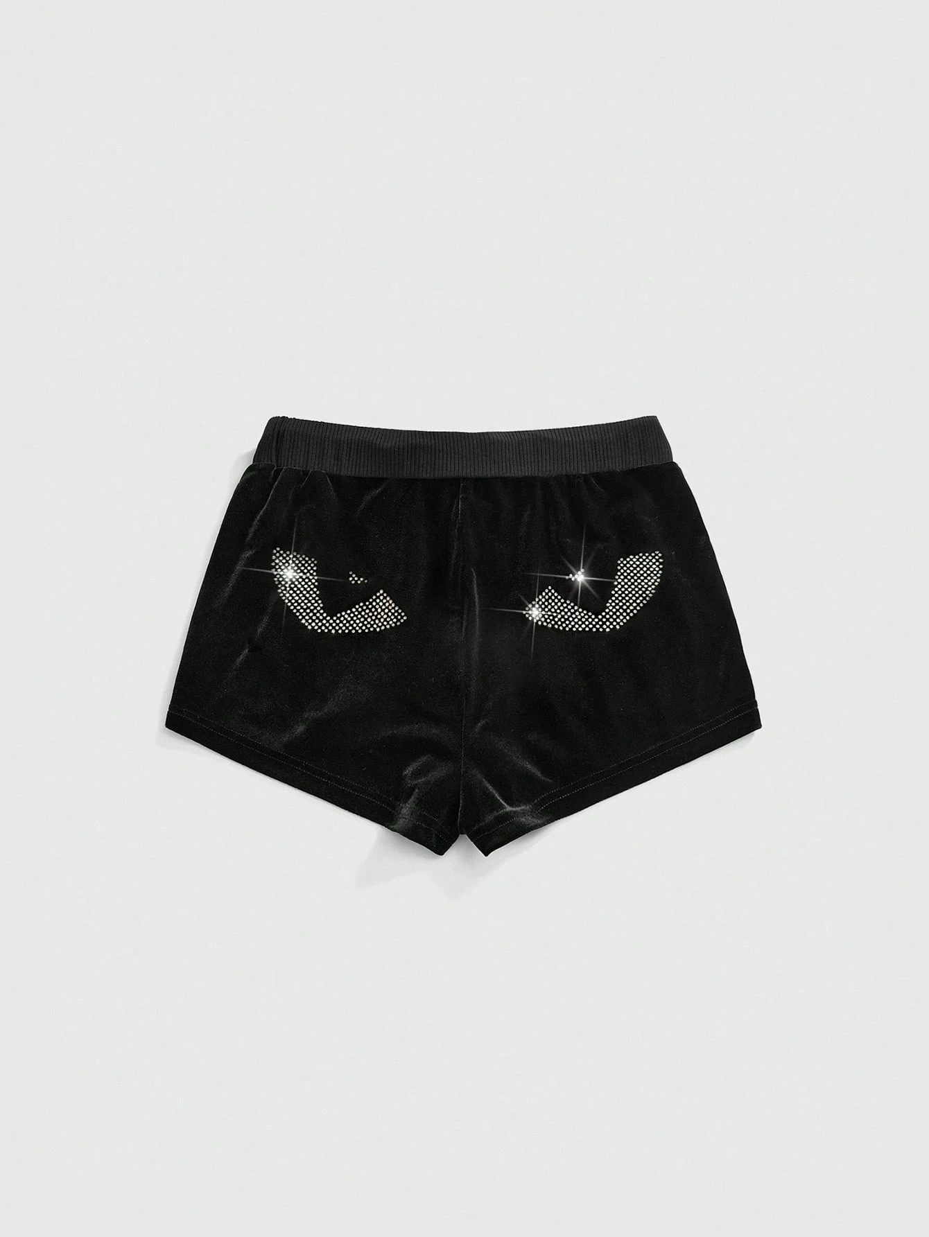 Goth Shorts negros de terciopelo con lazo, con expresión de personaje de gato sexy y lindo, con strass y lentejuelas para mujeres