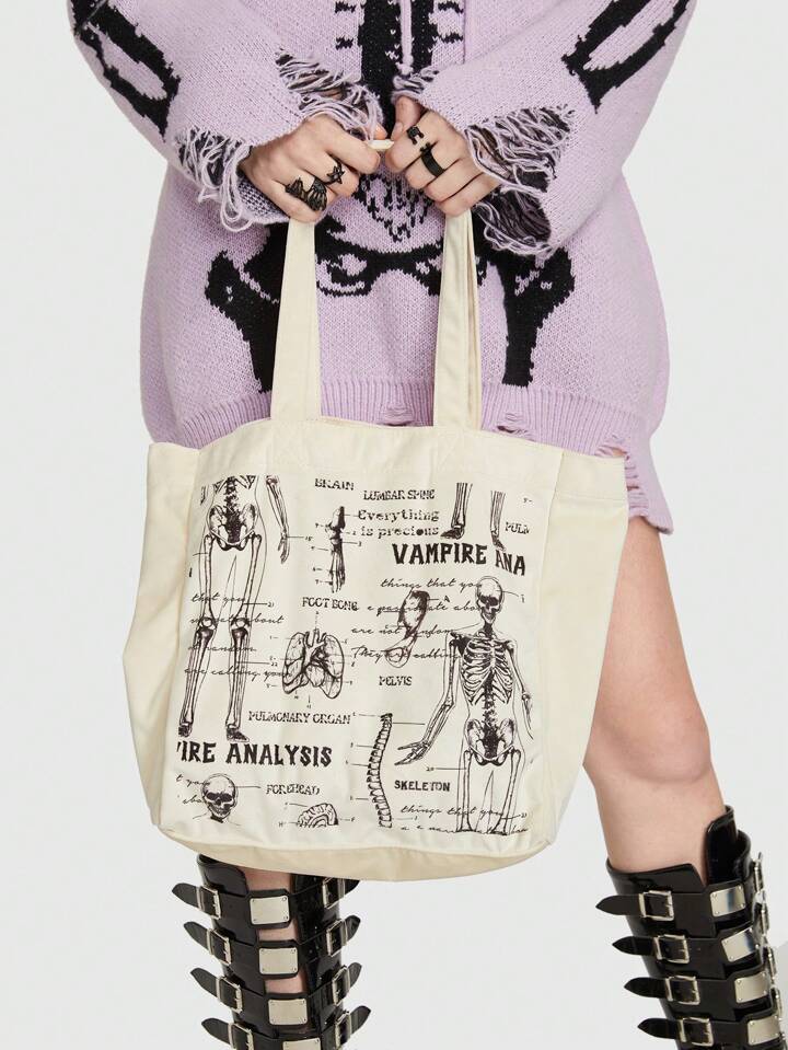 Goth Bolsa de compras pequeño casual con letra con estampado de esqueleto para compras