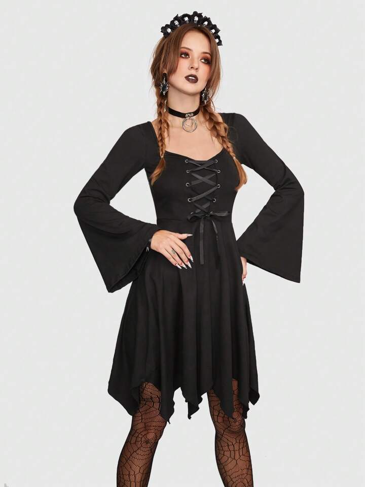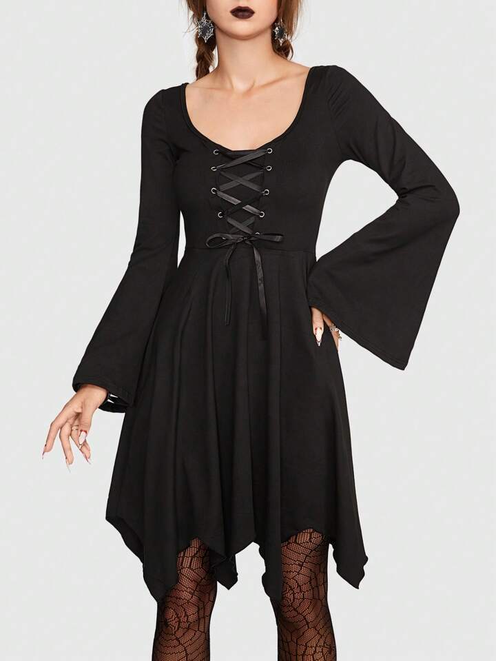 Goth Vestido unicolor con cordón de manga campana bajo hanky