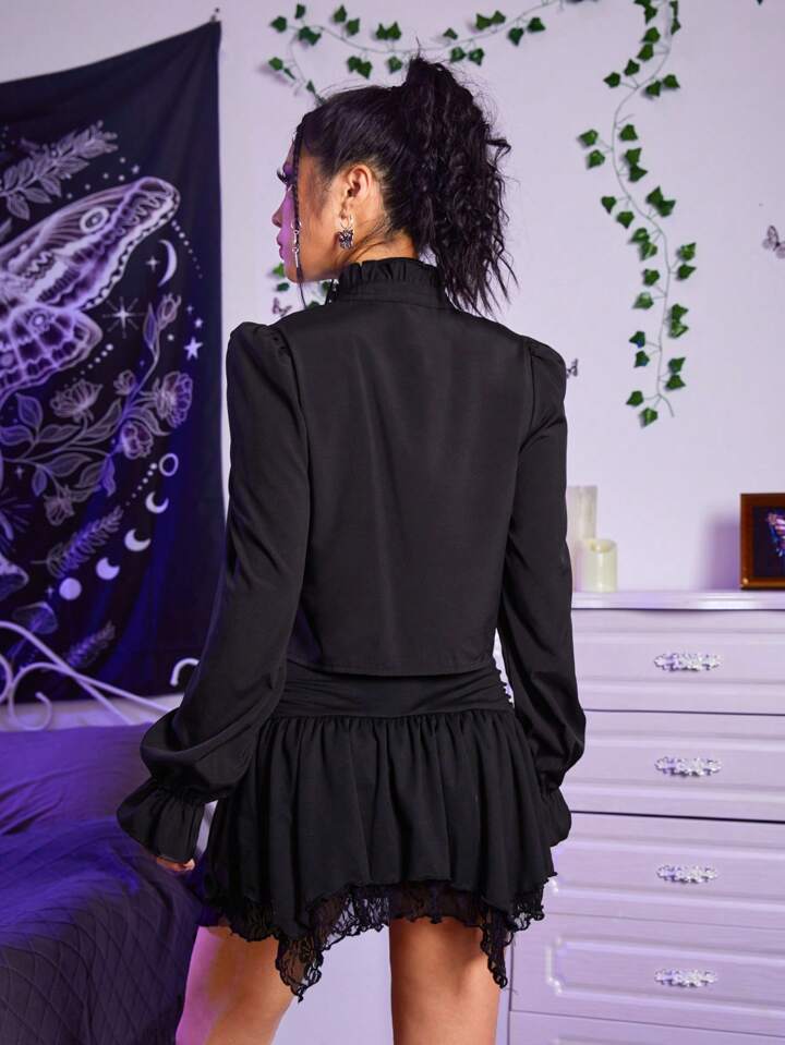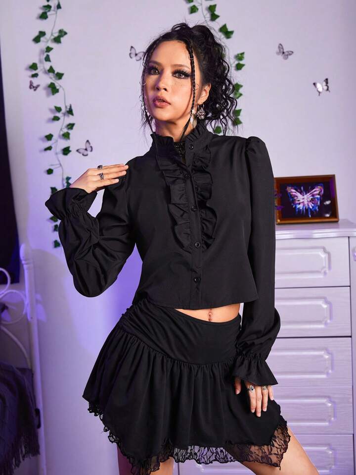 Goth Camisa unicolor ribete con fruncido de manga amplia