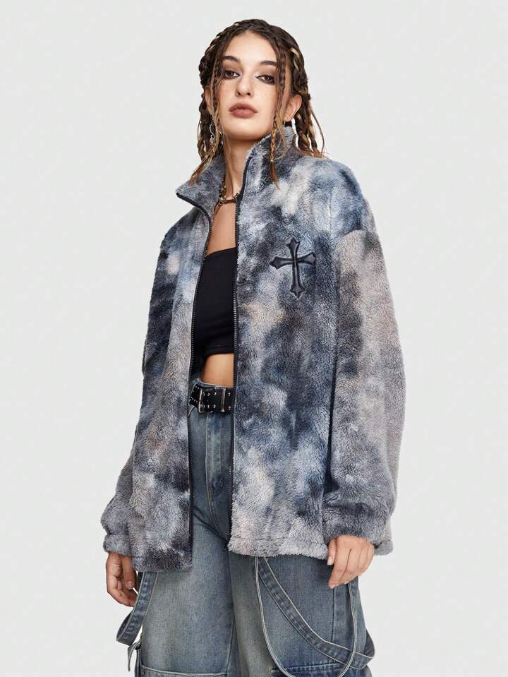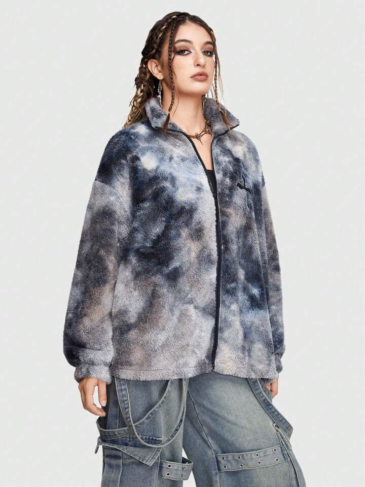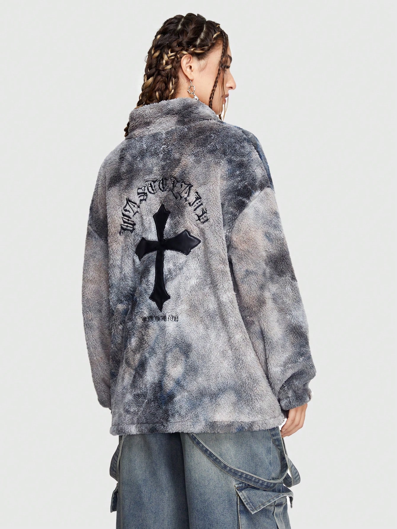 Goth Abrigo de tie dye con letra y dibujo con bordado de hombros caídos forro polar