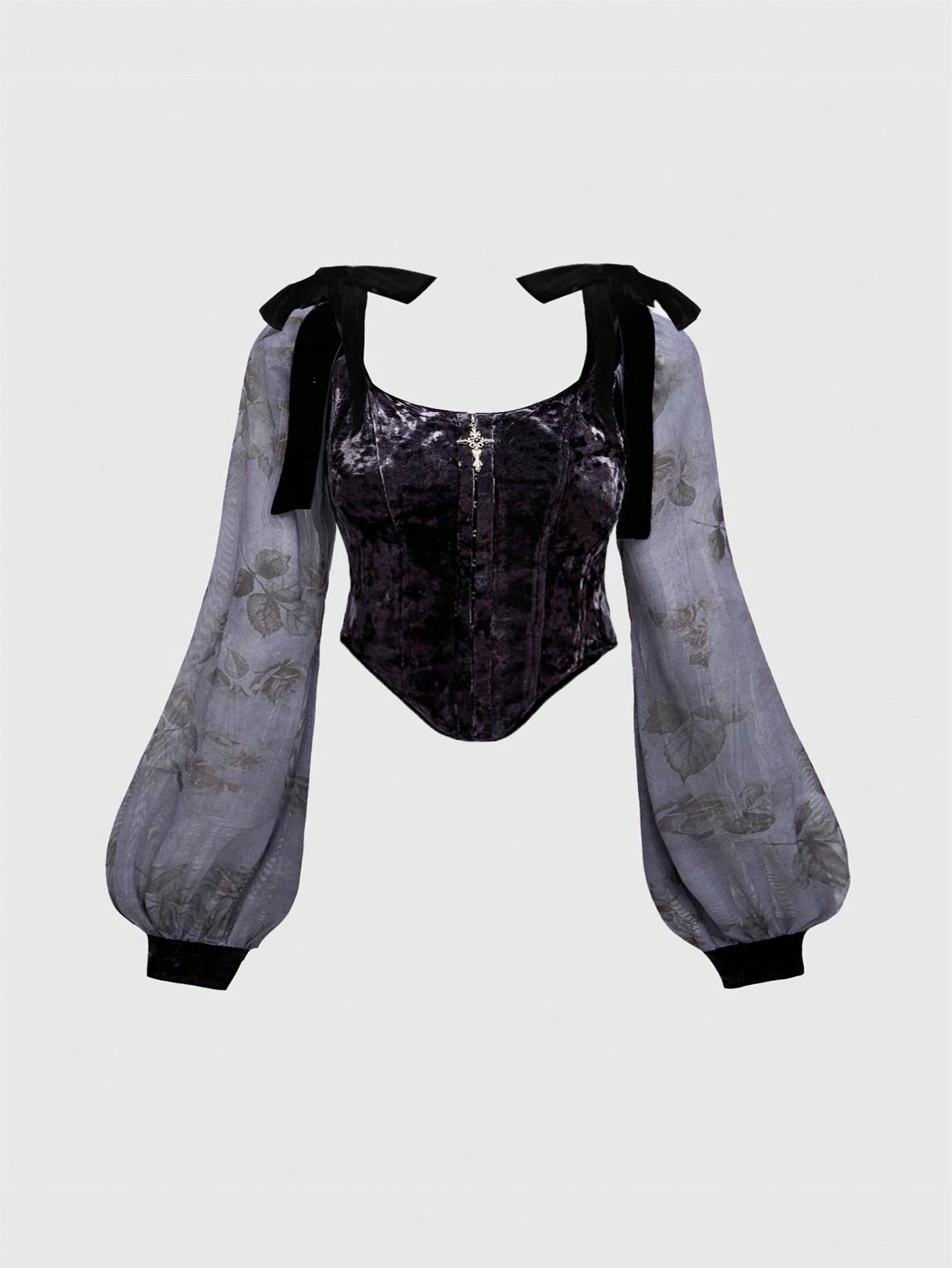 Goth Blusa de mujer talla grande con cordones y colgante de cruz de terciopelo, estilo vintage de otoño/invierno, con top de manga farol de parche de gasa con diseño de flor de rosa