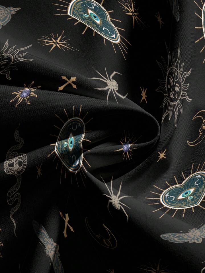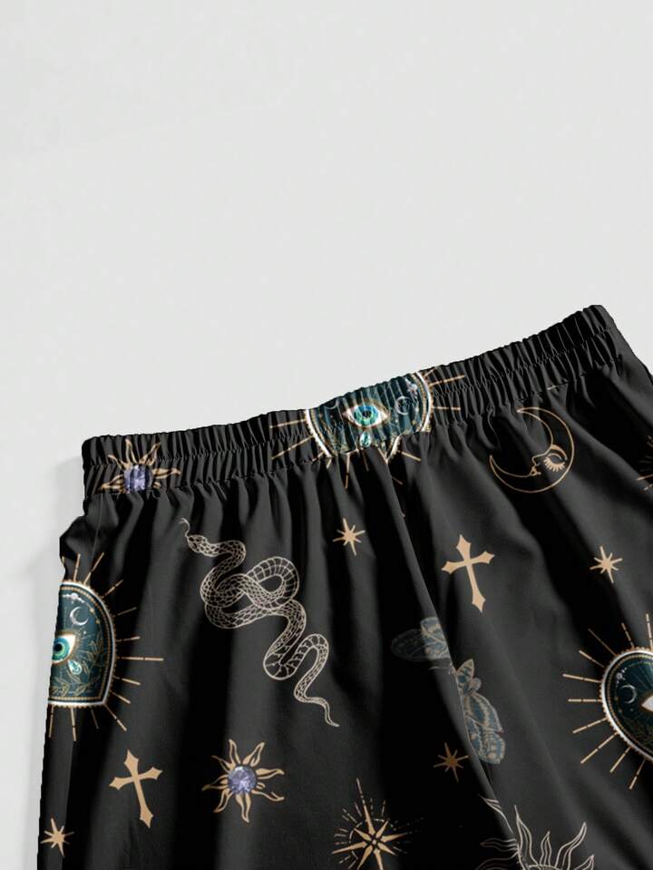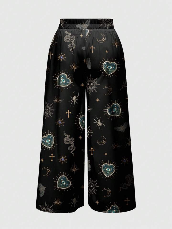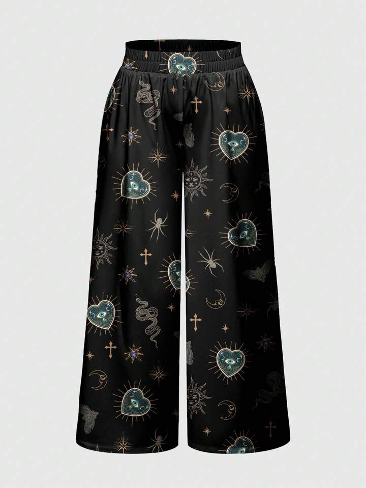 Goth Pantalones anchos de mujer con estampado de corazón, ojo, ala, lágrima, sol, luna, estrella, constelación y cruz en estilo vintage palaciego