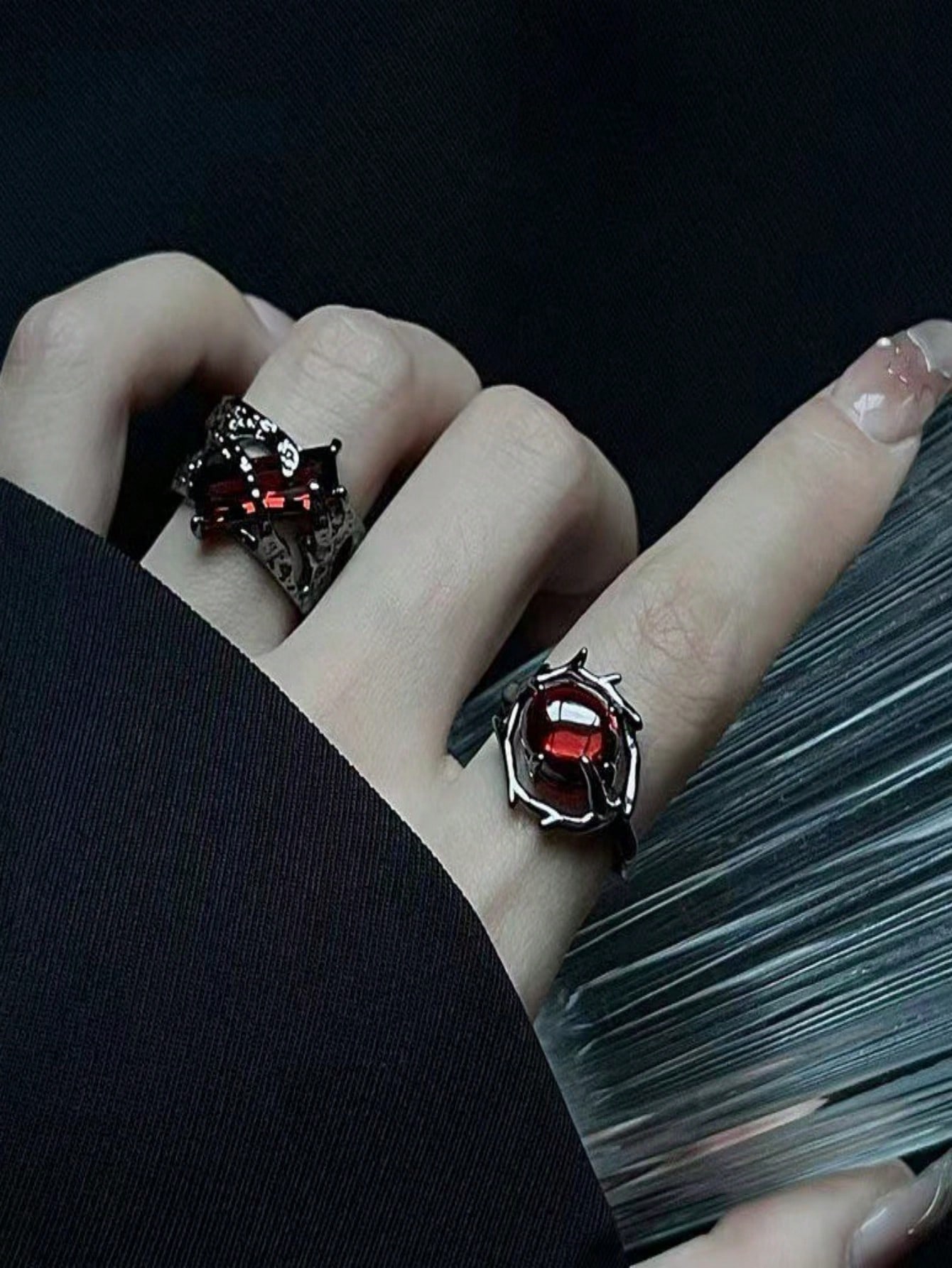 Goth Juego De Anillos Vintage De Diseño De Piedras Preciosas Geométricas Rojas Para Mujer, Anillo De Textura Hueca Punk Y Oscura
