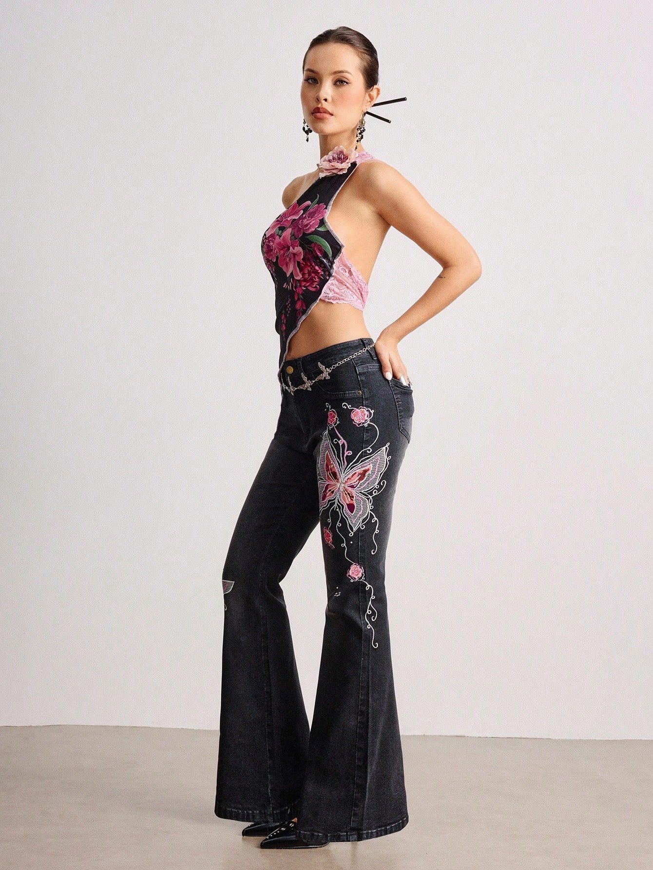 Goth Jeans de tiro bajo y acampanados con bordado jacquard de mariposas y rosas, estilo vintage Y2K para mujer