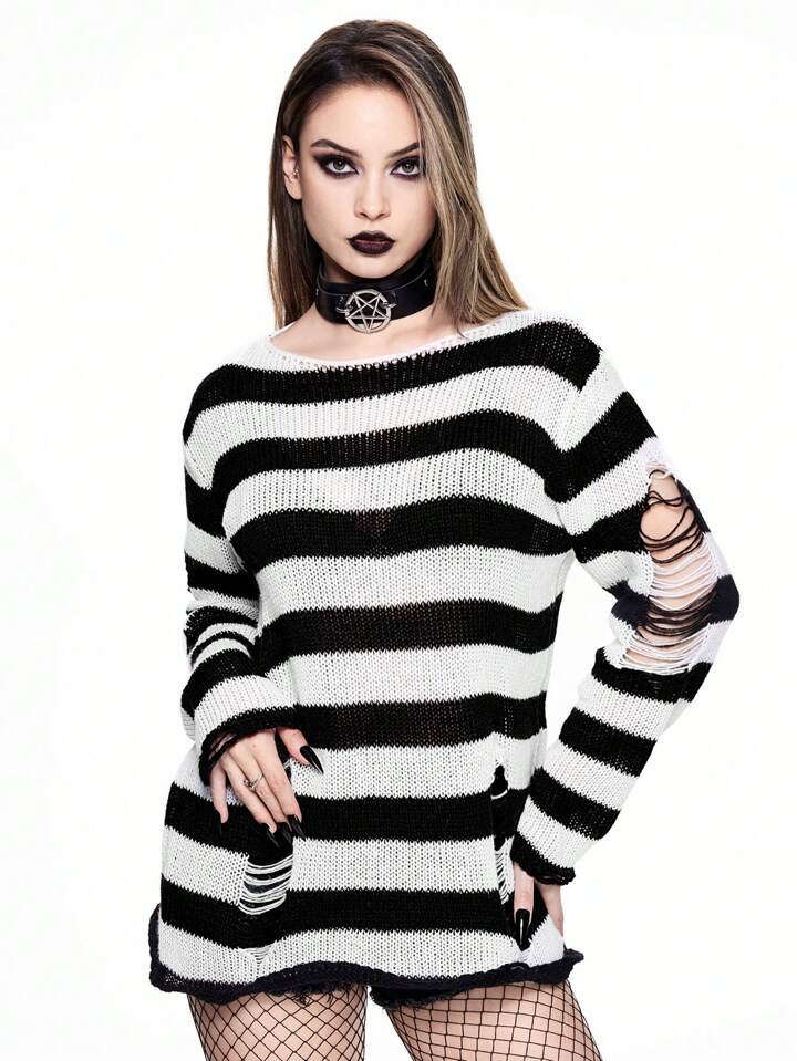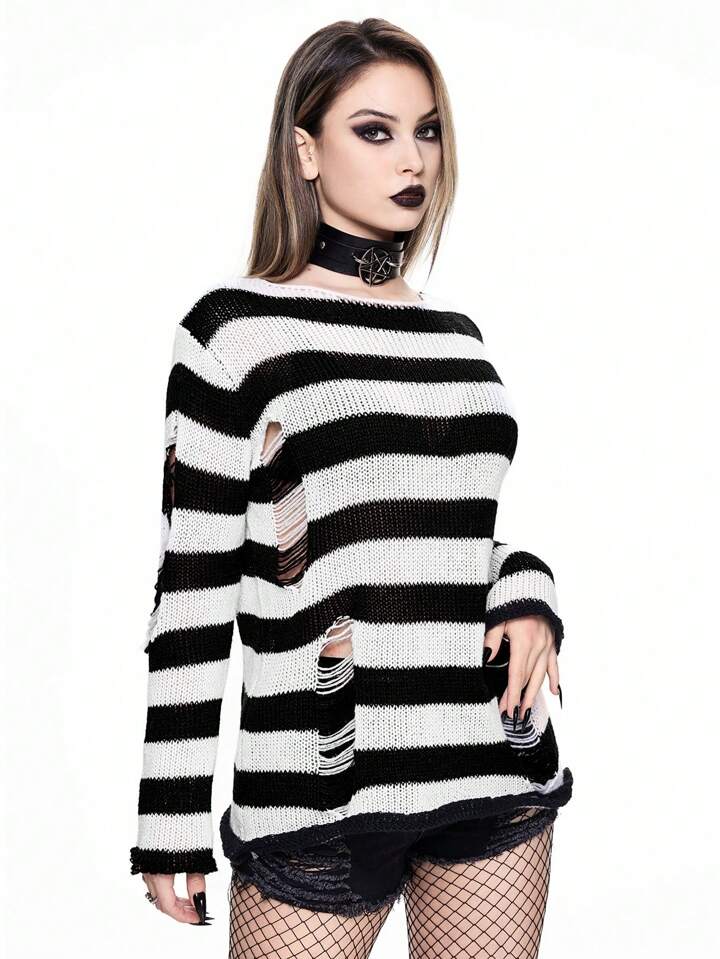 Goth Camisa minimalista con manga larga de rayas desgastada de uso diario para mujer