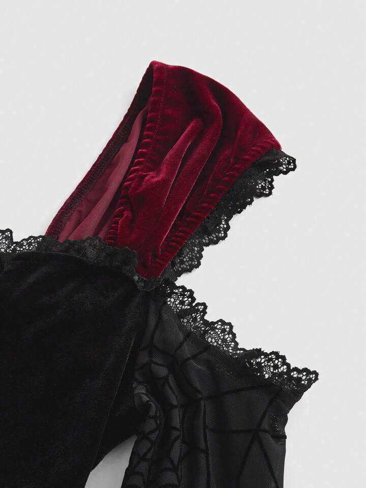 Goth Blusa de estilo gótico para mujer con mangas abullonadas, parches de terciopelo y diseño de telaraña