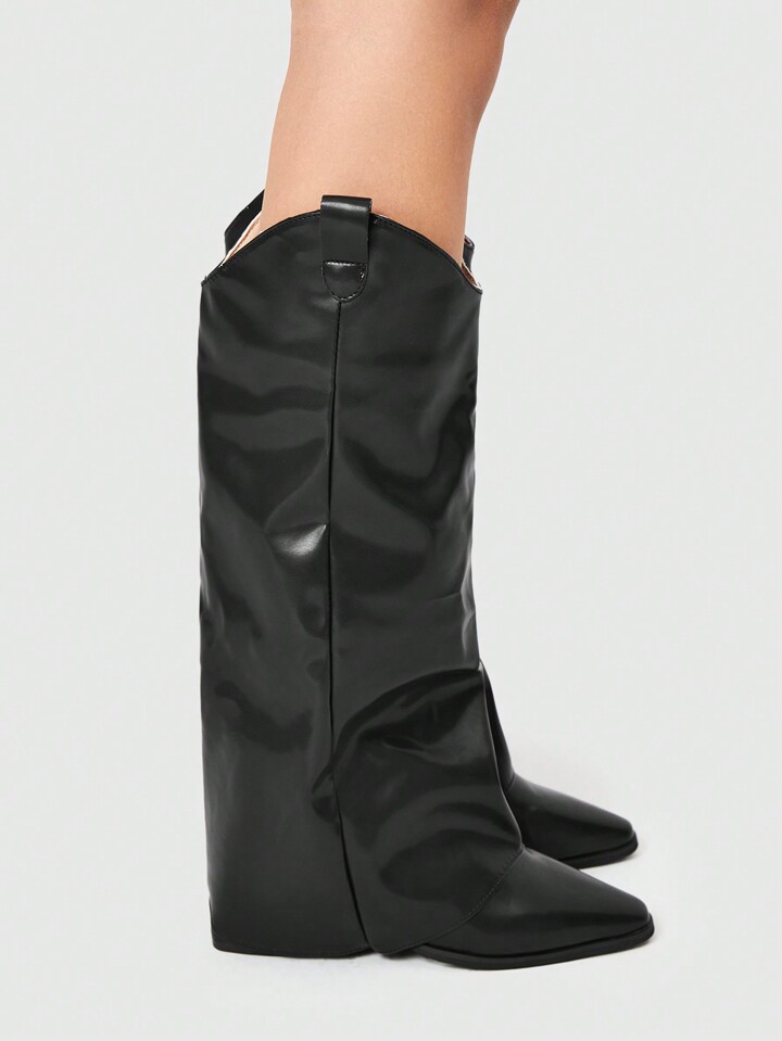 Goth Botas de caña media con puntera puntiaguda y tacón alto en piel patente y efecto patchwork para mujer. Botas informales tipo caballero para el ambiente navideño y de Año Nuevo en otoño e invierno, color negro