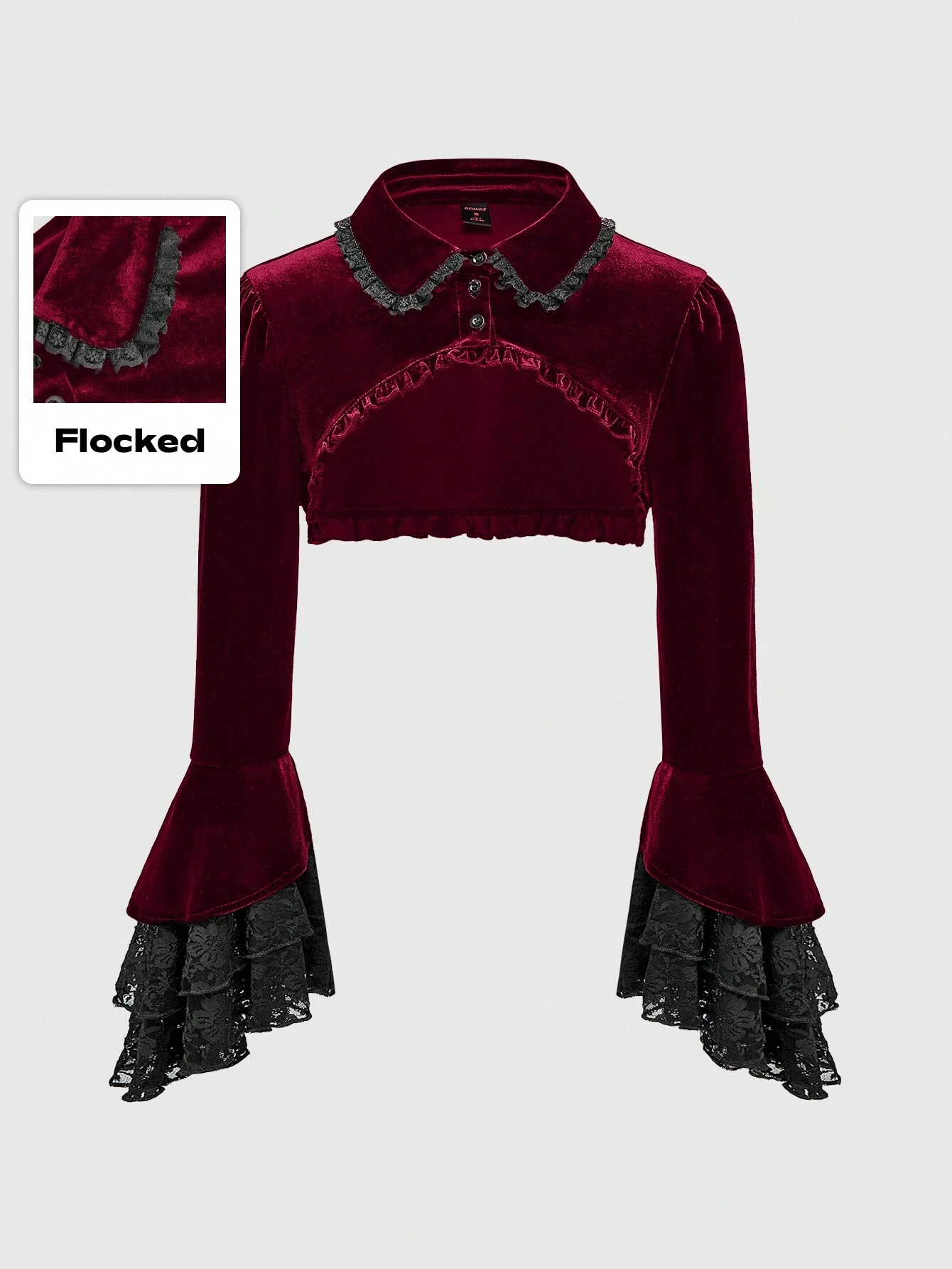 Goth Blusa de mujer de terciopelo burdeos con mangas de campana, estilo gótico vintage y romántico, con encaje en contraste