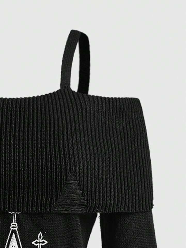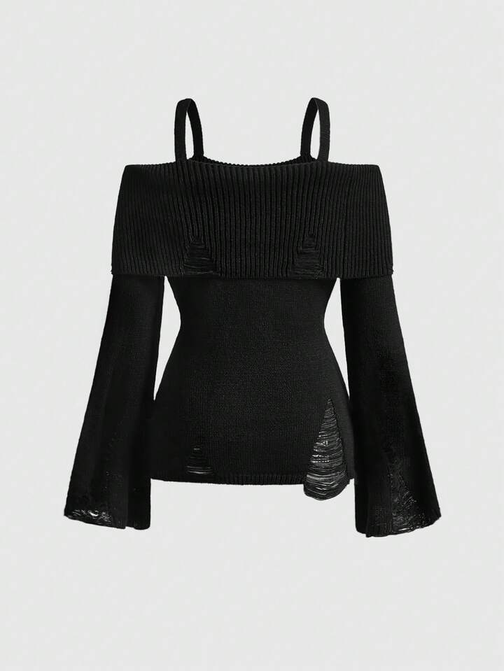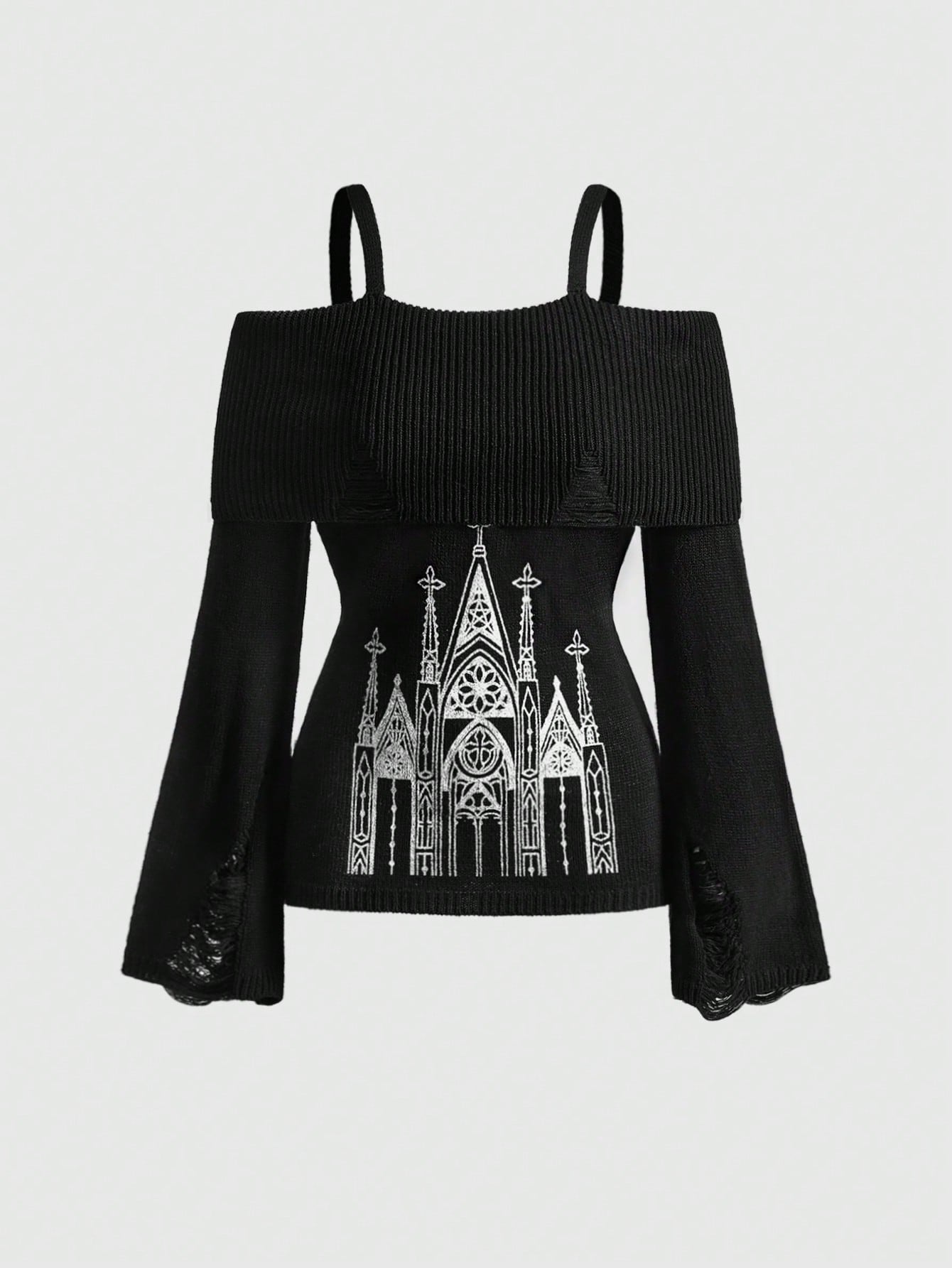 Goth Suéter casual de mujer con cuello vuelto, hombros descubiertos, tirantes finos, estampado de castillo oscuro y mangas acampanadas