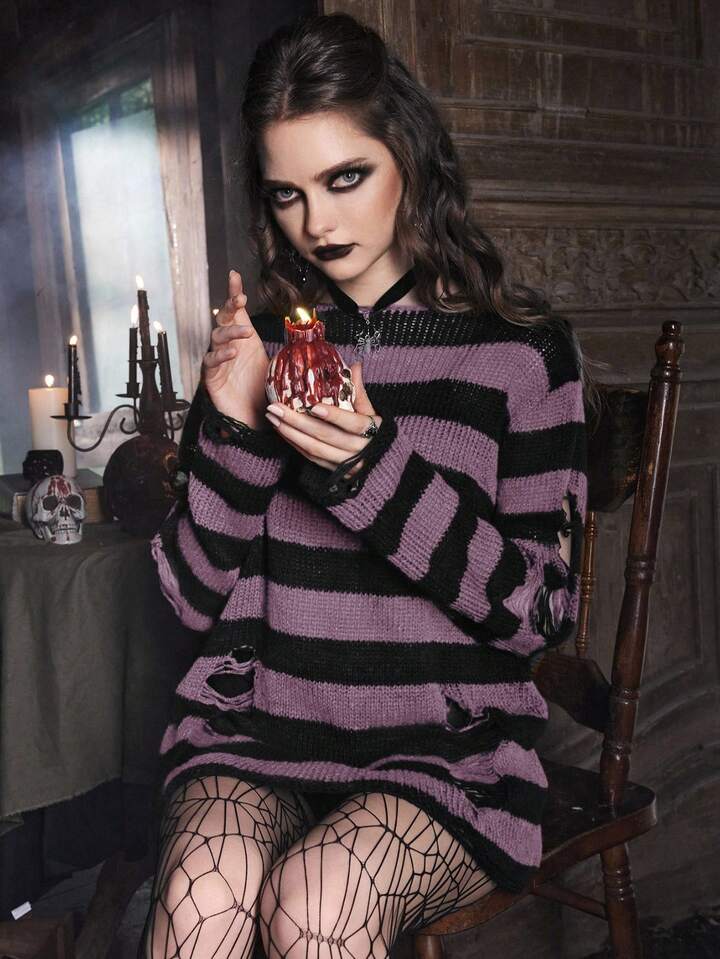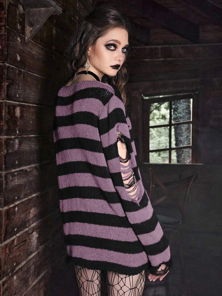 Goth Suéter holgado de mujer con patrón de rayas de dos tonos y efecto desgastado, adecuado para otoño/invierno y Halloween