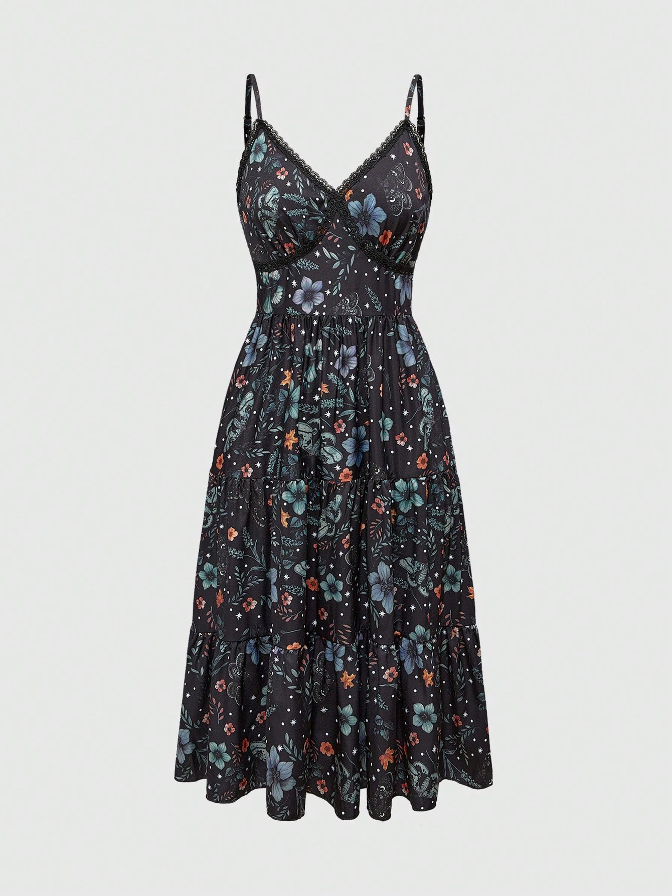 Goth Vestido largo de tirantes con estampado todo sobre de polilla y flores de color púrpura oscuro para mujer