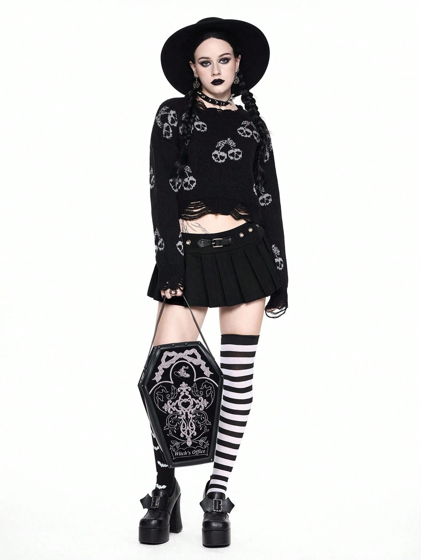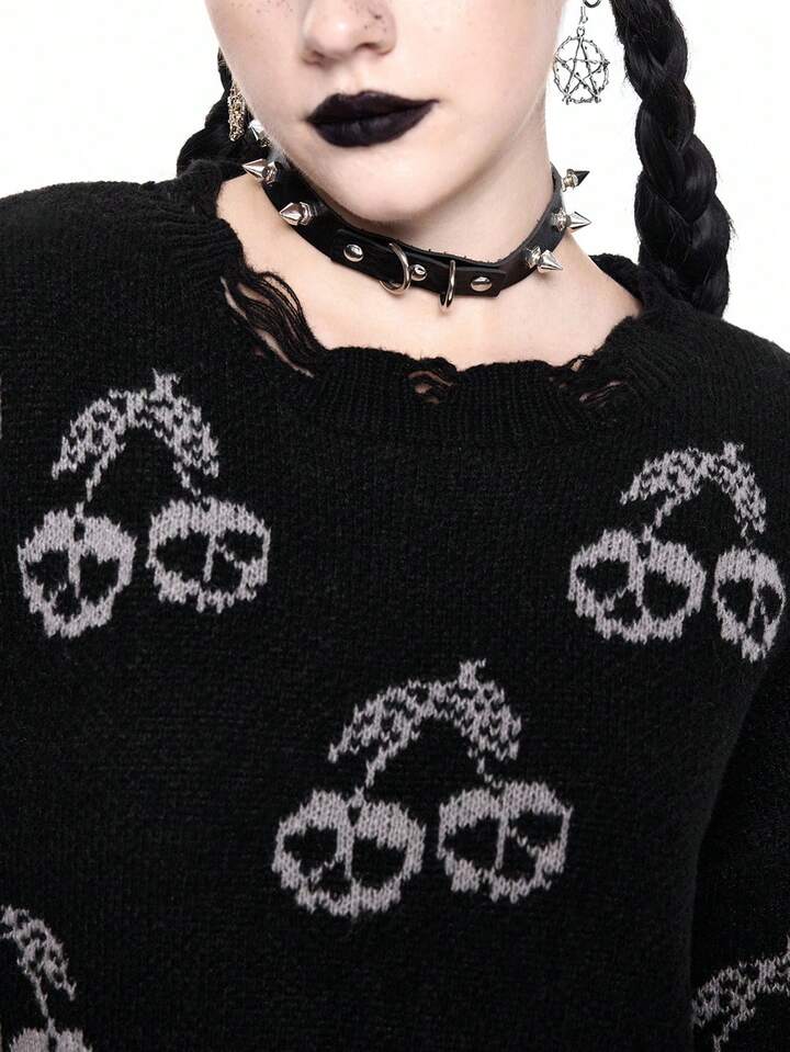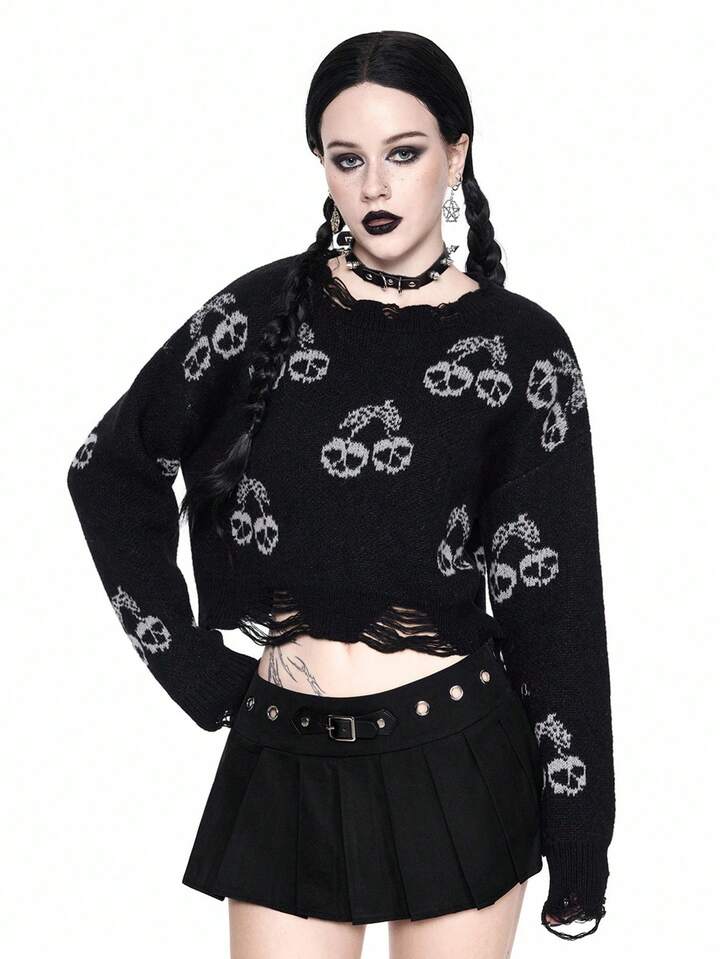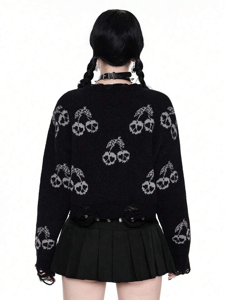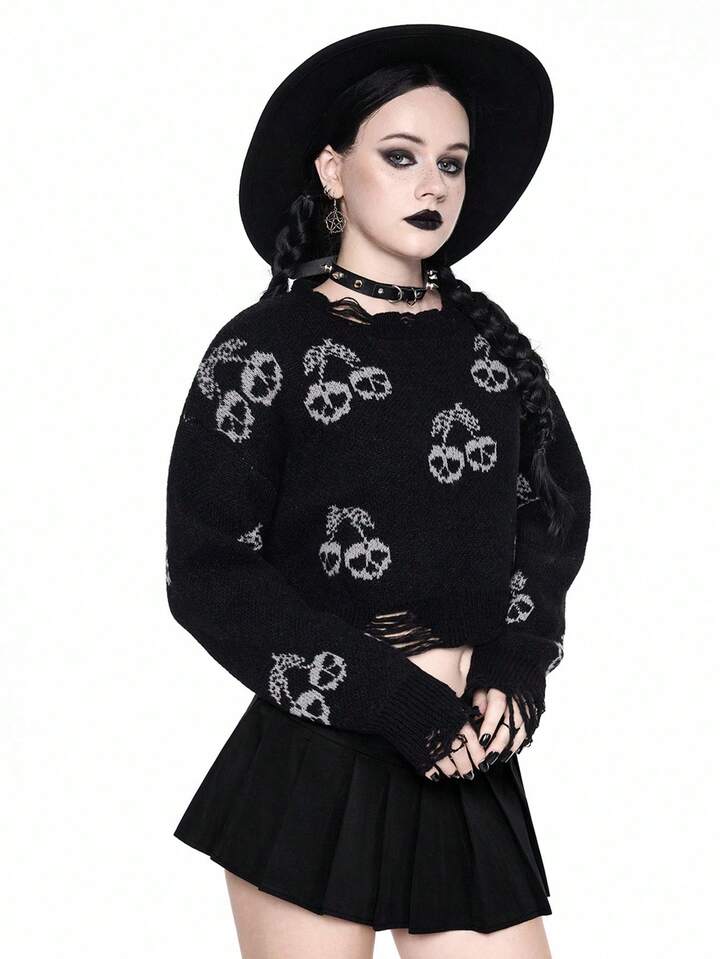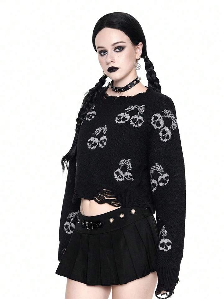 Goth Suéter corto de mujer con calavera oscura y cereza desgastada, Halloween