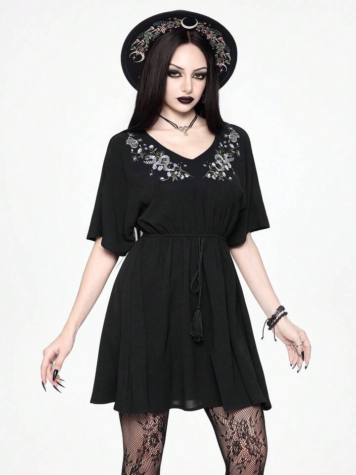 Goth Vestido corto elegante de mujer con cintura ceñida y mangas cortas bordadas