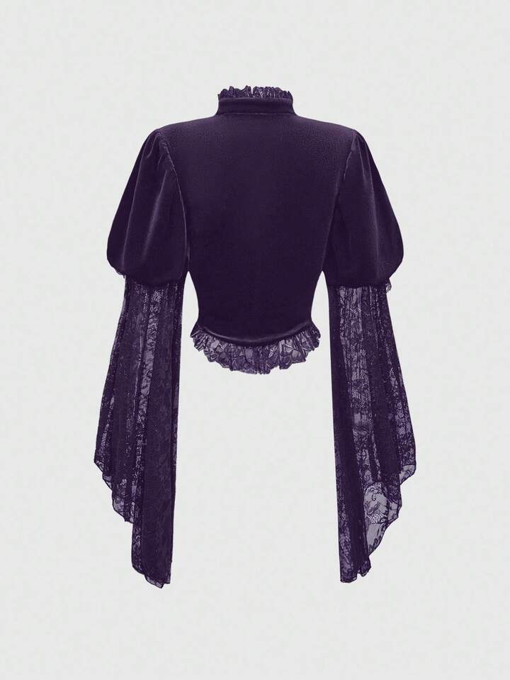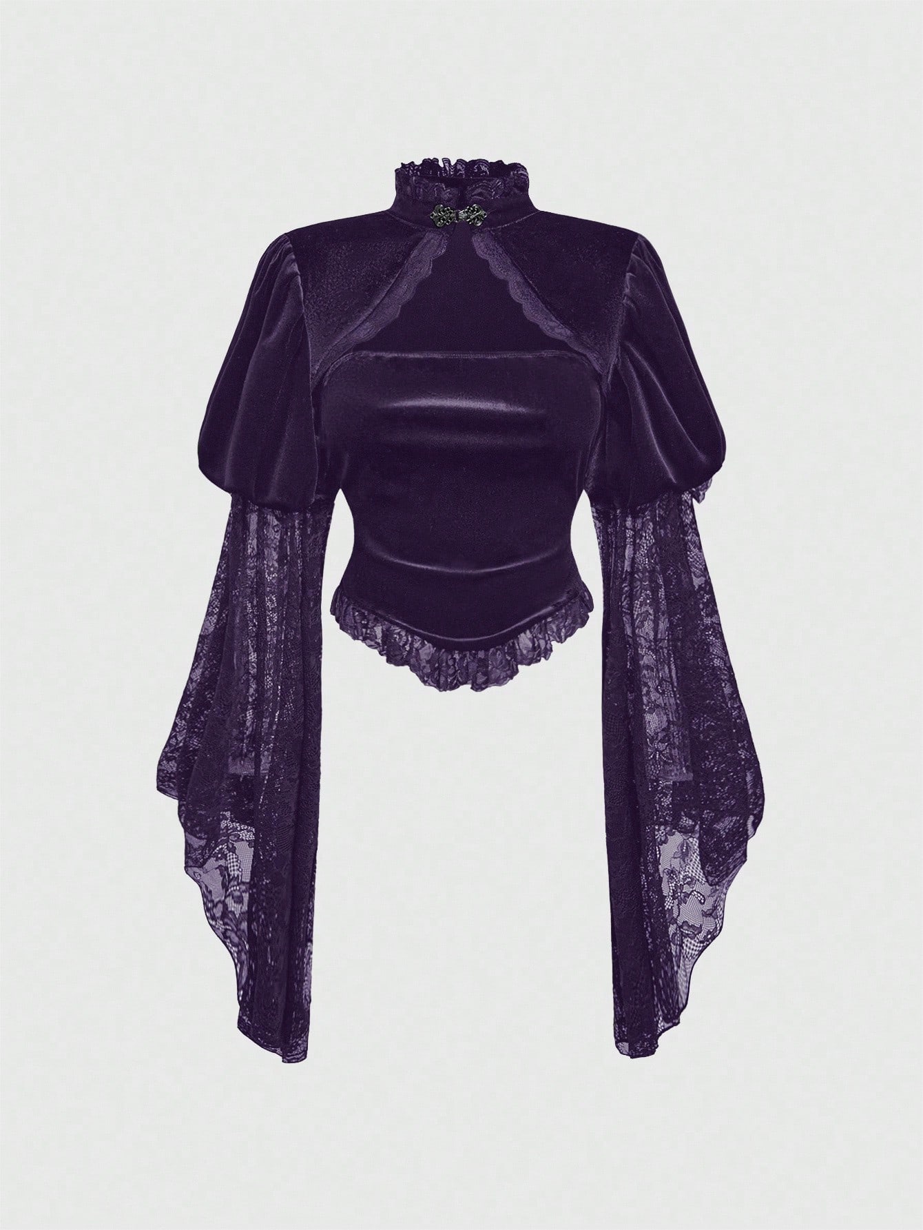 Goth Blusa elegante de mujer con cuello alto, mangas acampanadas, de terciopelo y encaje con diseño de parches