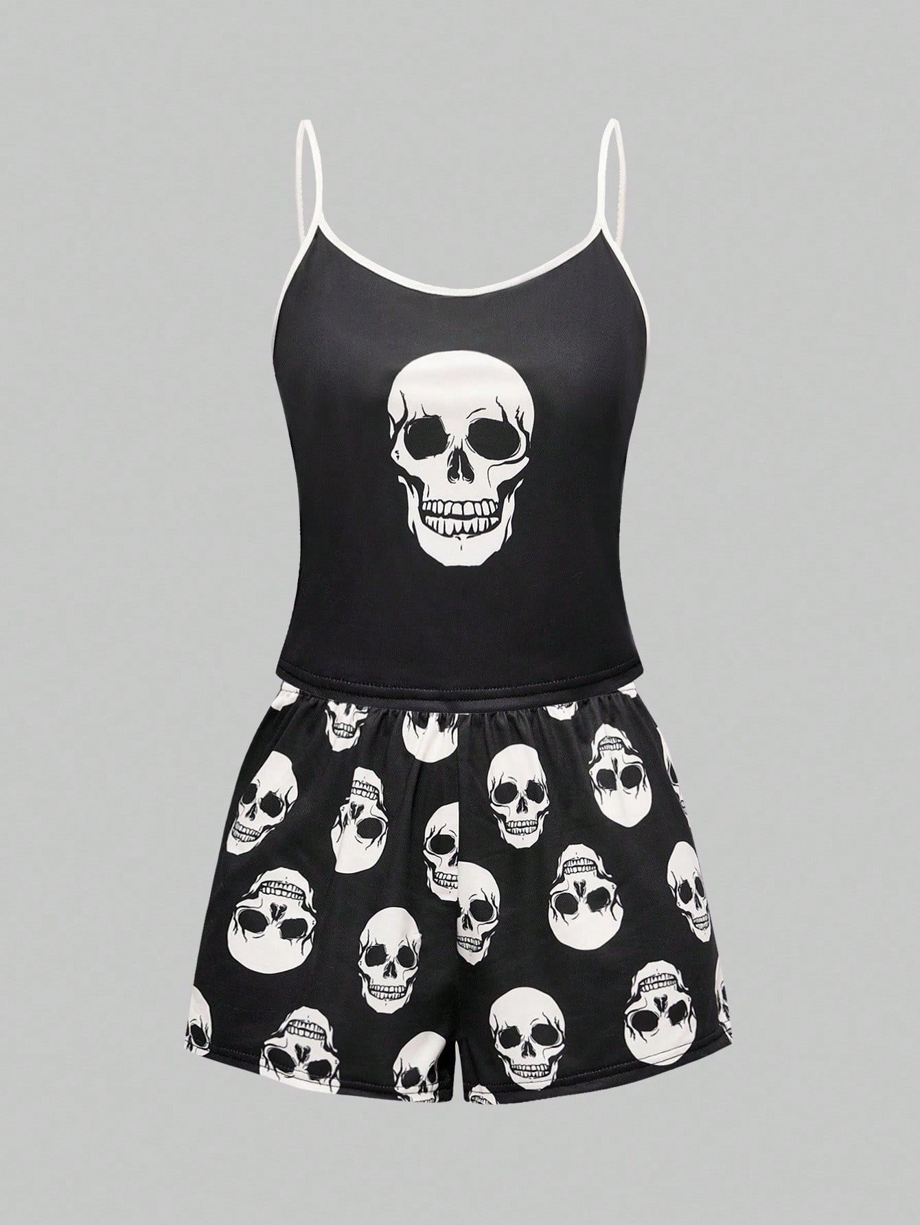 Goth Conjunto de pijama casual de camiseta de tirantes y pantalones cortos con estampado gótico de contraste de color para mujer