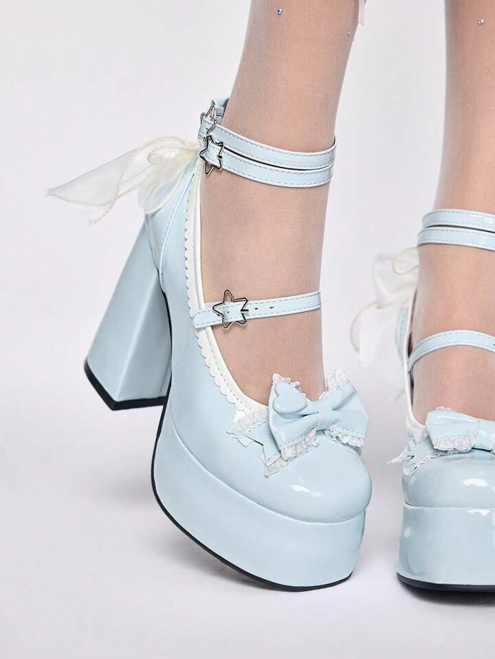 Goth Zapatos de estilo de Maryjane para mujeres, zapatos de tacón grueso con plataforma impermeable, zapatos tipo Lolita con lazo, zapatos tipo mule de punta redonda, zapatos negros formales para vestido