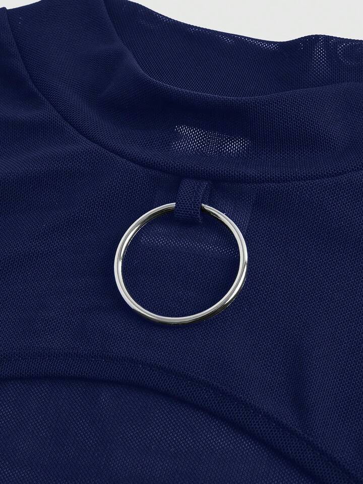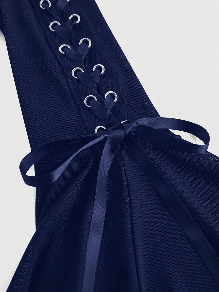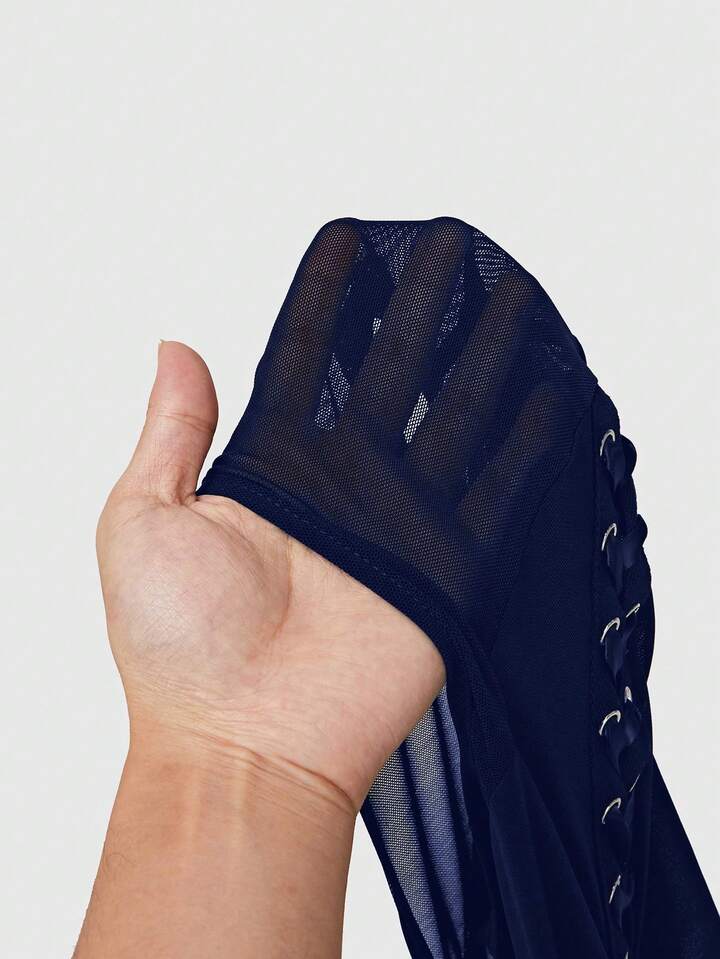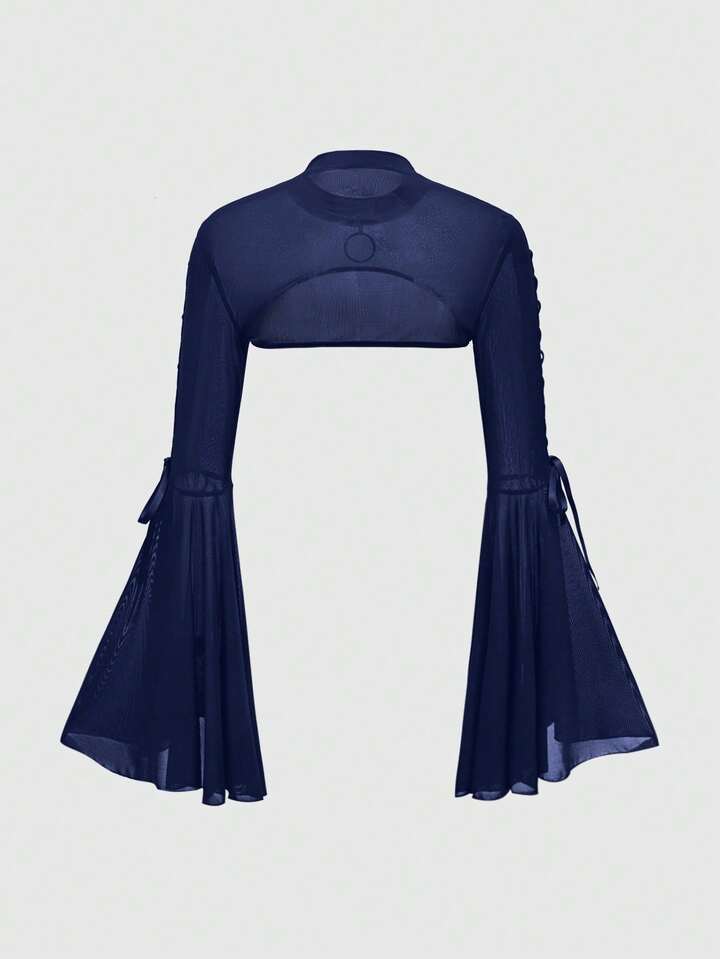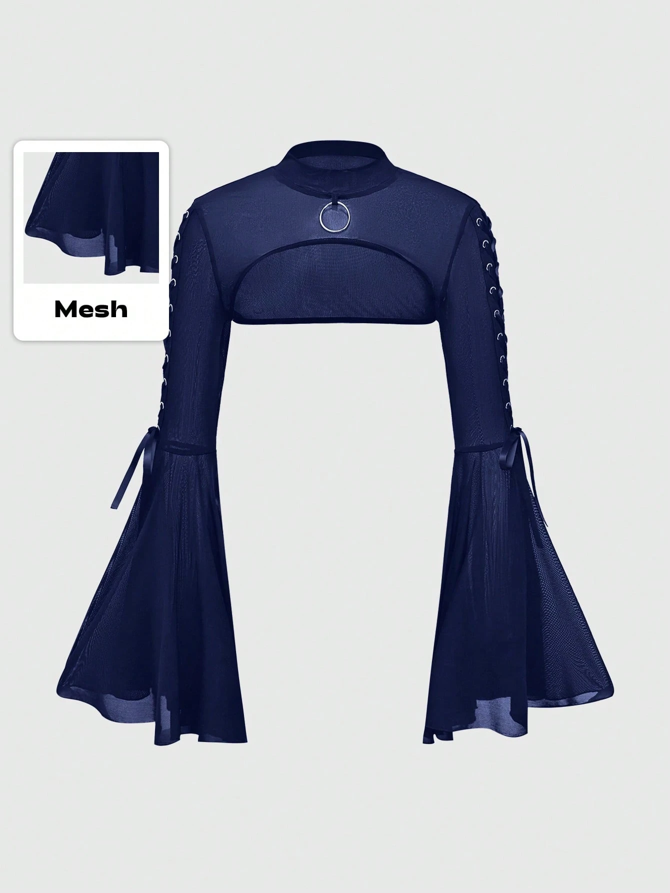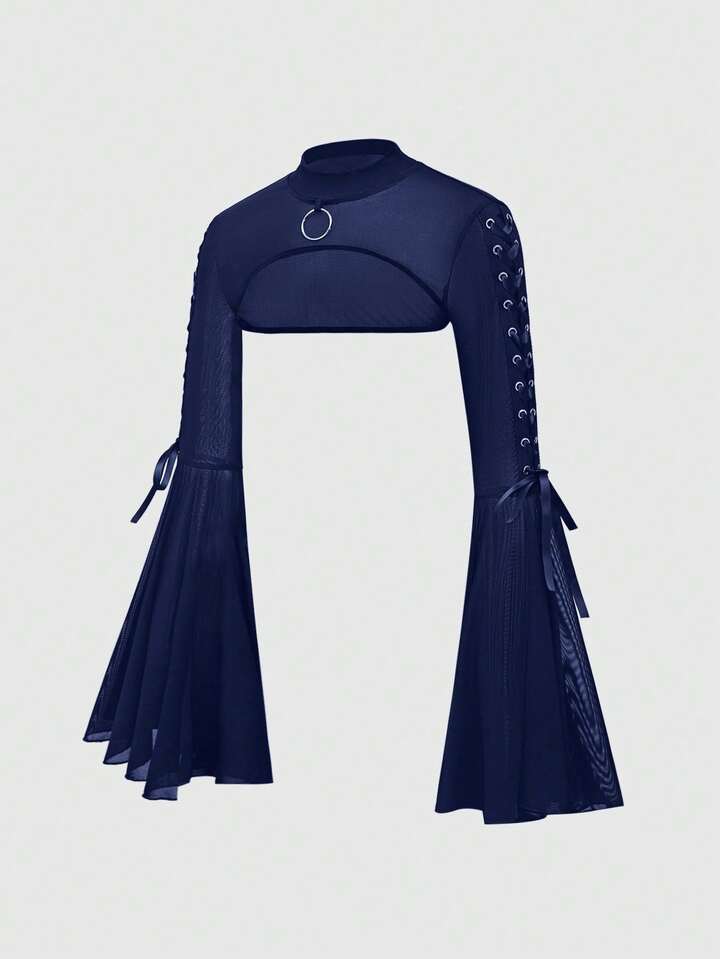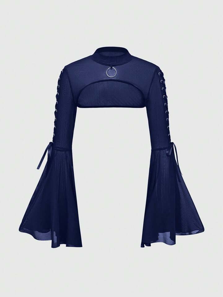Goth Blusa de mujer con mangas acampanadas, cordones y encaje de ojal de malla