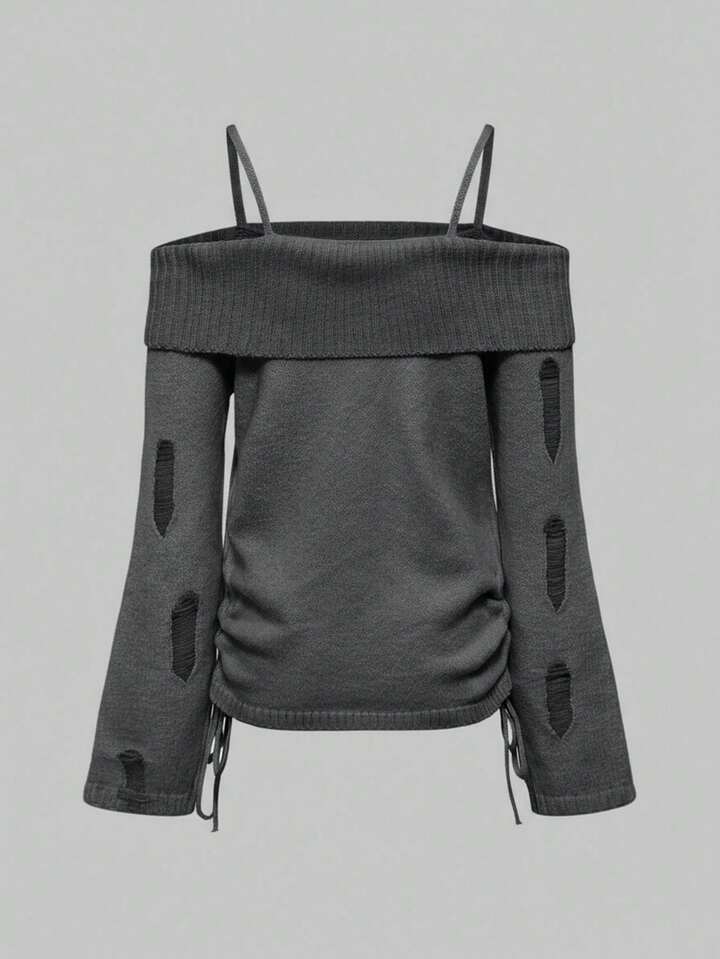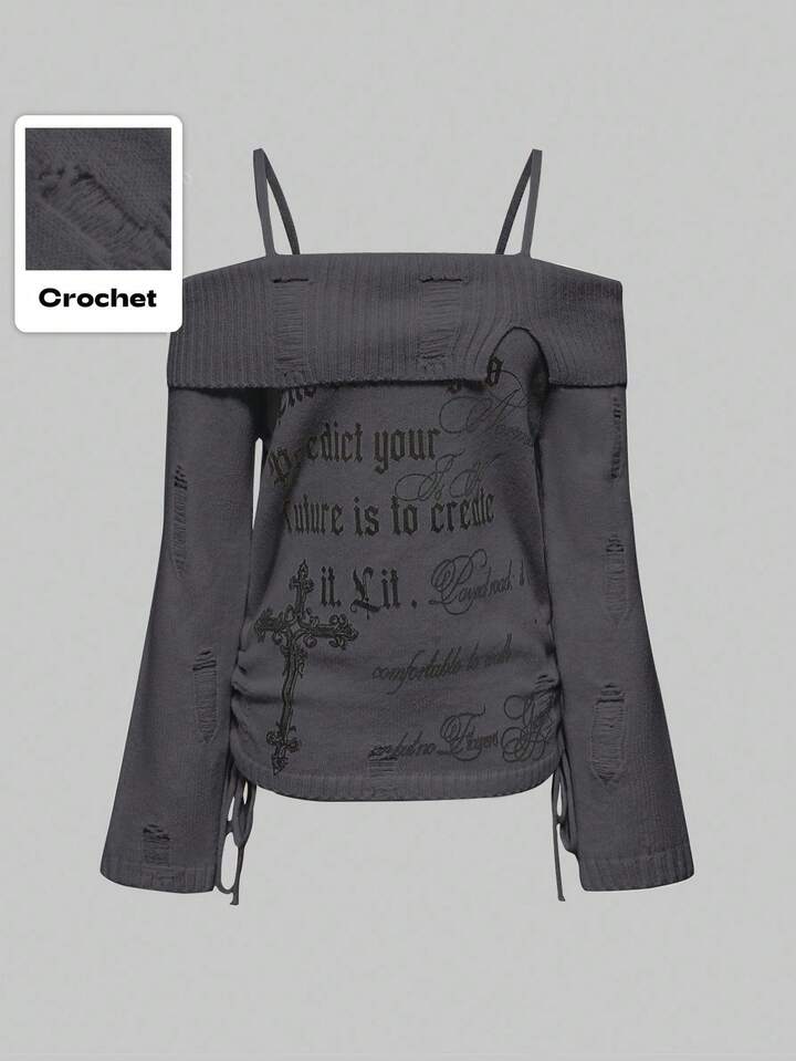 Goth Suéter ajustado con hombros descubiertos y gráfico de cruz punk para mujer