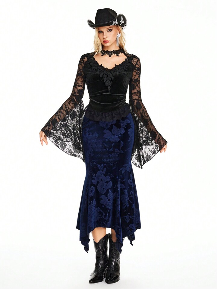 Goth Camiseta ajustada con mangas abullonadas en estilo retro punk grunge Y2K, de terciopelo y encaje en parches