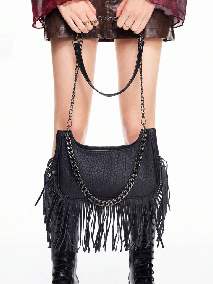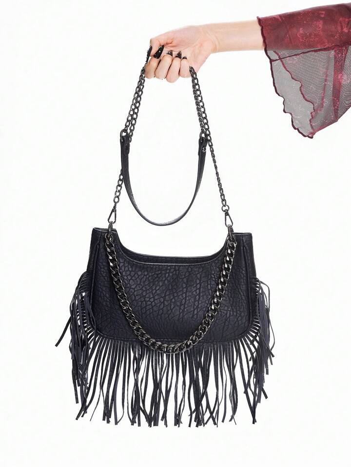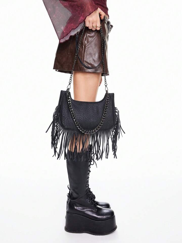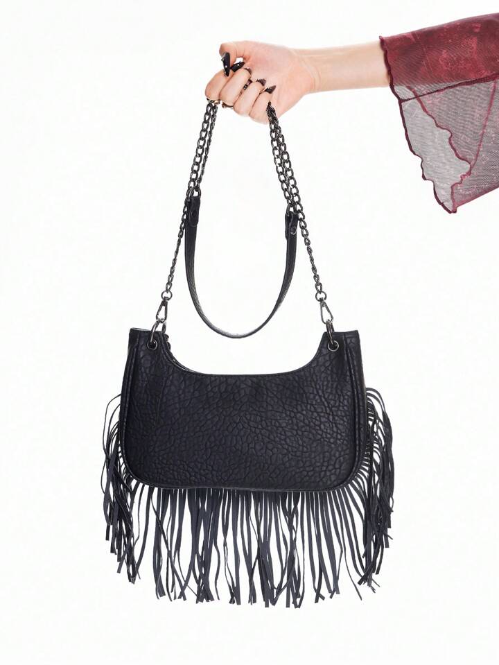 Goth Bolso de hombro con flecos de estilo retro punk para mujer, bolso de cadena de moda de alta gama para uso casual y de oficina