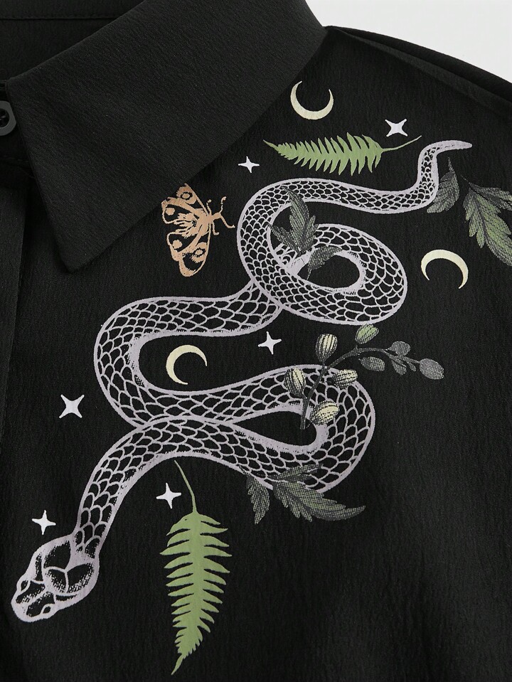 Goth Vestido casual de manga corta con estampado de serpiente, mariposa, estrella y luna para mujer, escuela