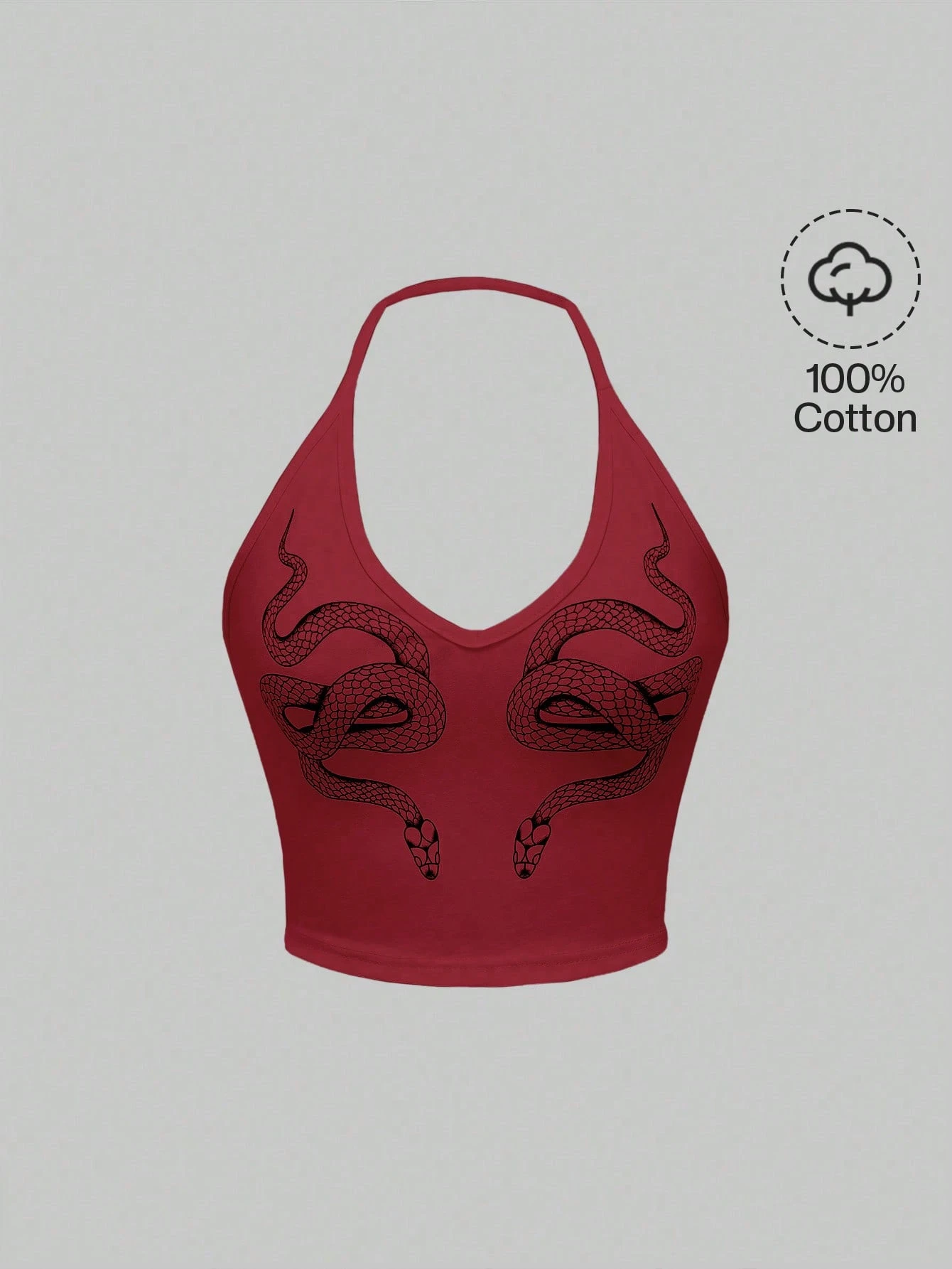 Goth Blusa crop top de mujer de corte ajustado con estampado de serpiente y cuello halter