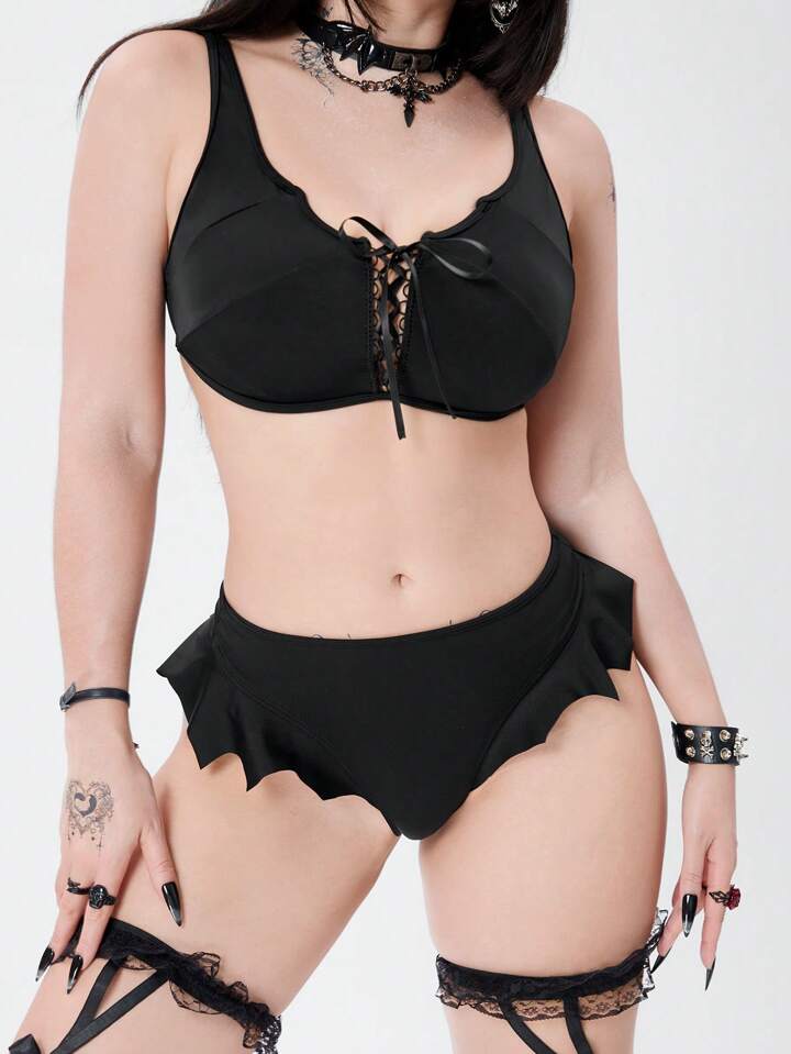 Goth Conjunto de bikini sexy con amarres de unicolor para mujer, Halloween
