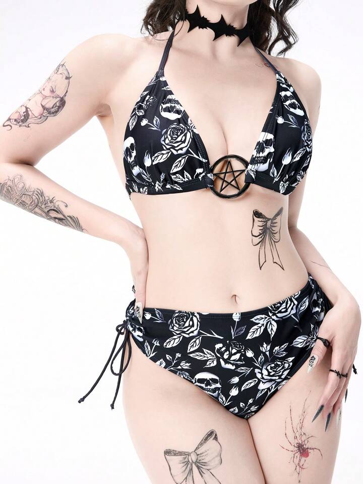 Goth Conjunto de bikini sexy de tirantes con estampado floral de playa de verano para mujeres