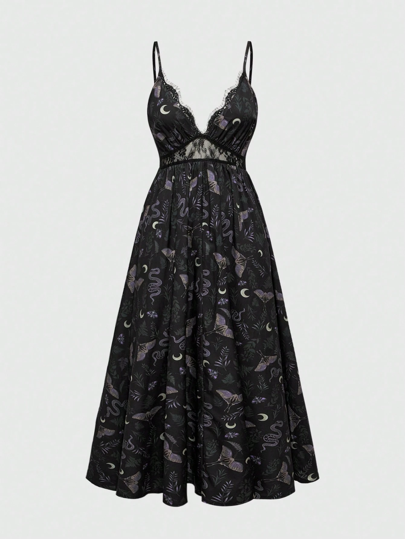 Goth Vestido largo con estampado completo de mariposa, luna y bosque misterioso vintage para mujer