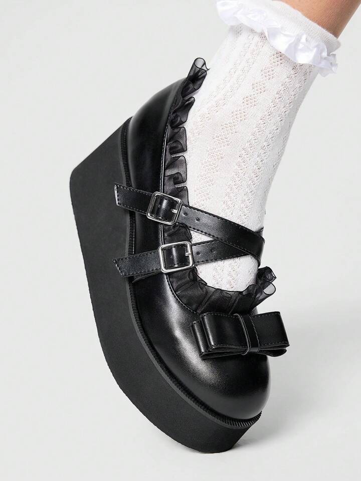 Goth Mocasines de mujer con plataforma y cuña, estilo punk, punta redonda, suela gruesa y decoración con hebilla, color negro