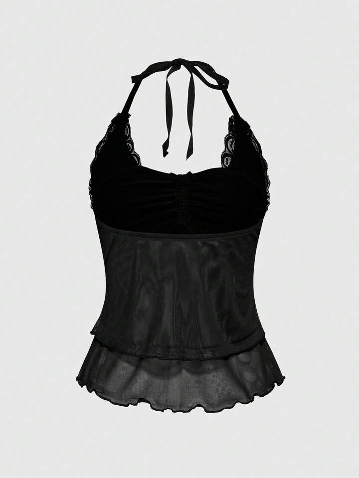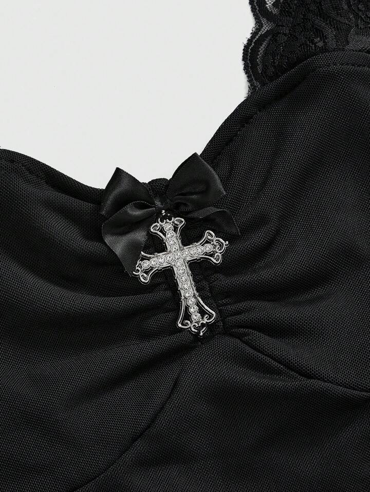 Goth Top de tirantes finos con encaje asimétrico de contraste y diseño de cruz, estilo Y2K punk para mujer