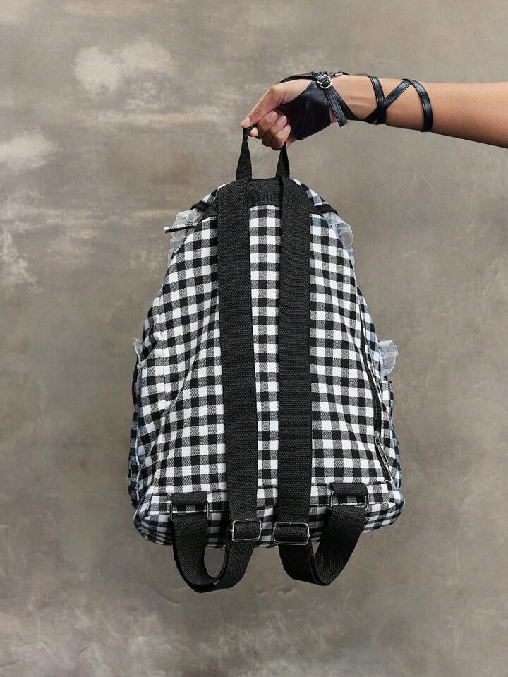 Goth Mochila psicodélica con bolsillos múltiples a cuadros, lunares y corazones- Mochila casual de gran capacidad con tapa con cierre y remaches- Mochila universitaria con cordón y parches de encaje para viajes