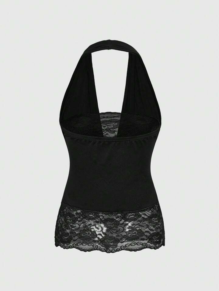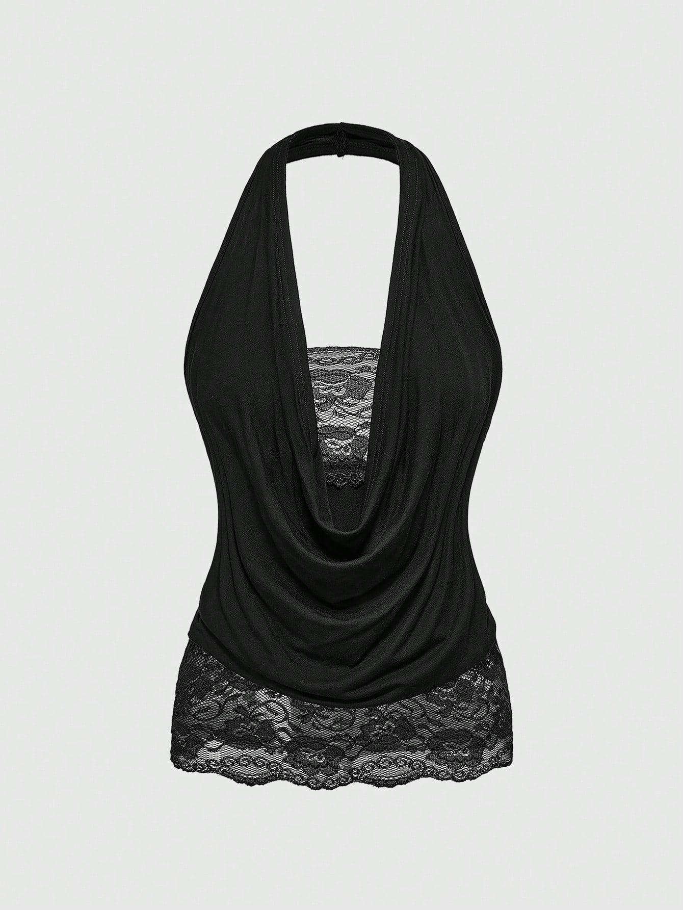 Goth Top sin espalda con cuello con drapeado de encaje y contraste, estilo retro Y2K