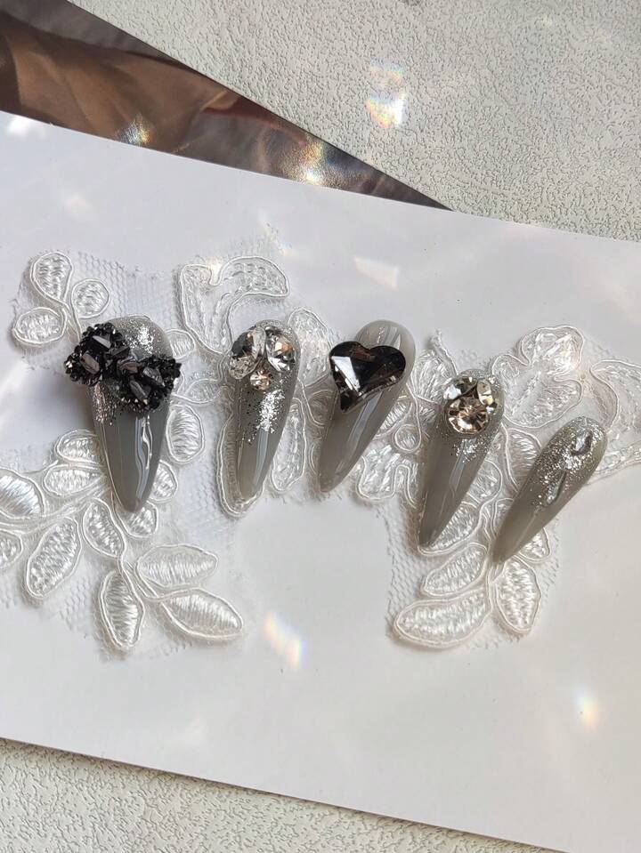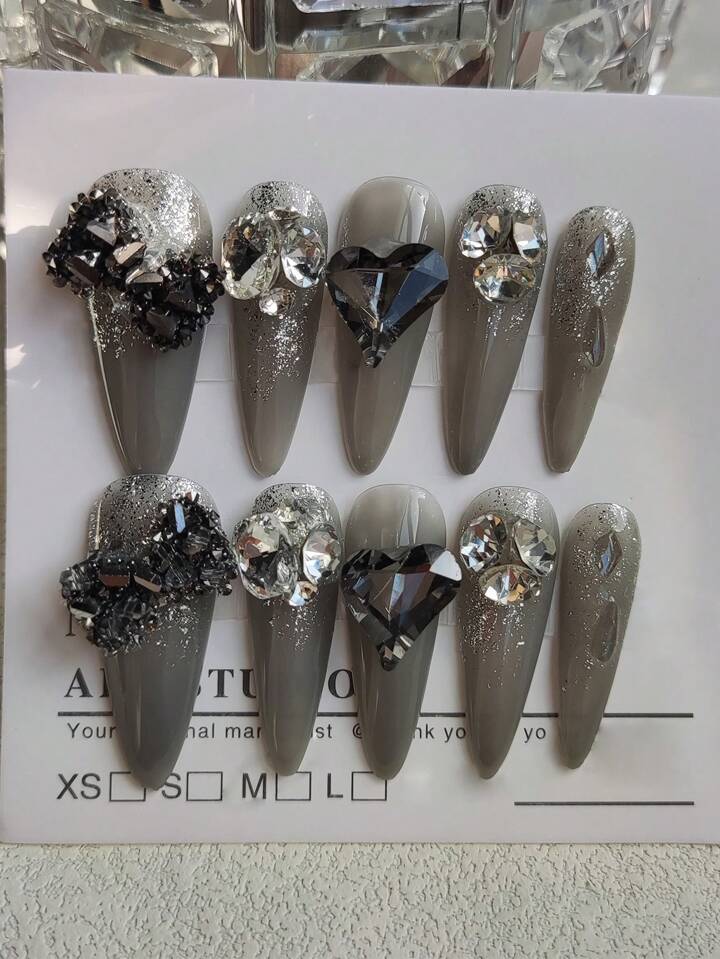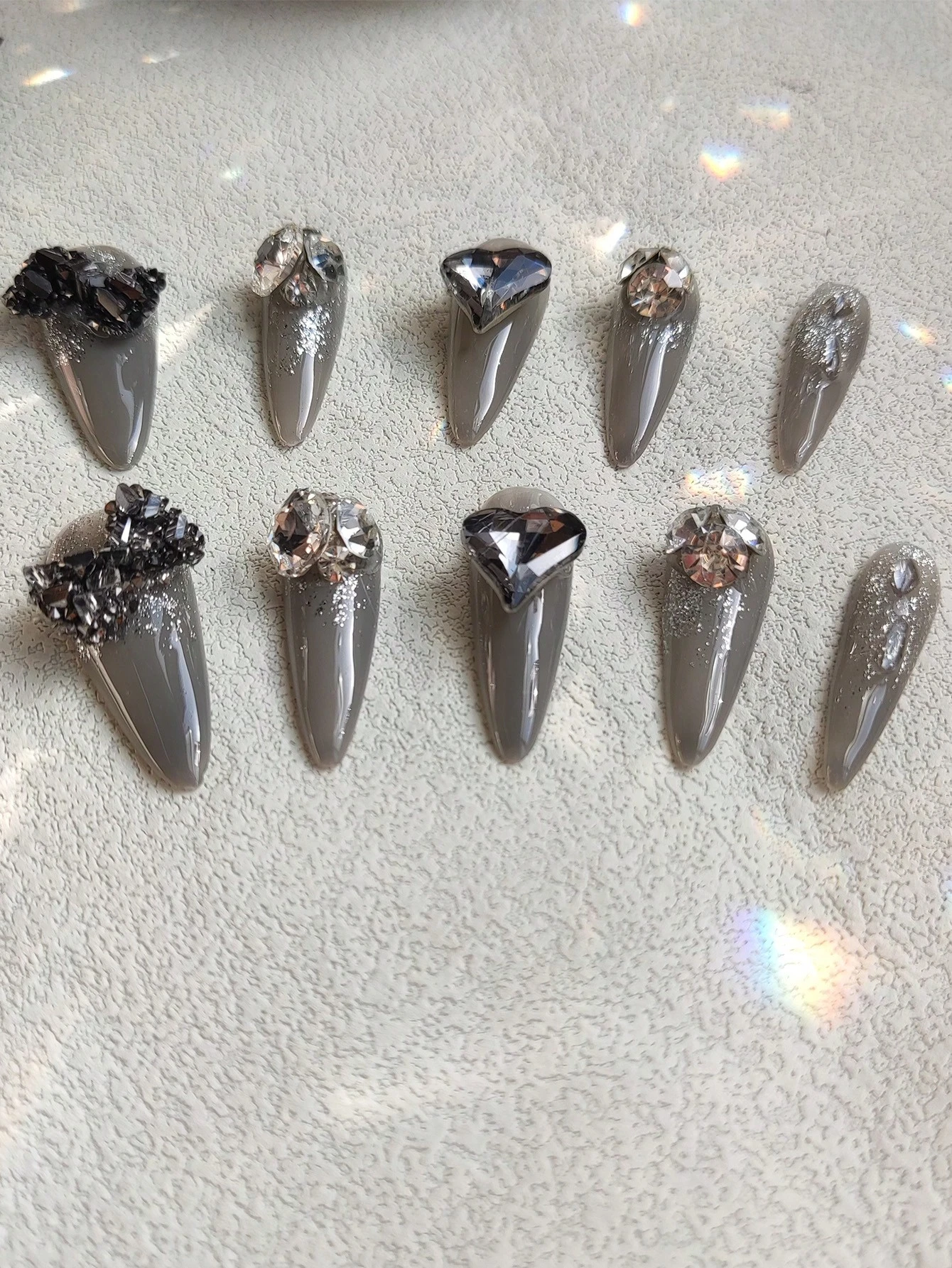 Goth (en Stock) 10 Piezas De Uñas Falsas Grises De Alta Calidad Y Largas Con Pegamento Jelly