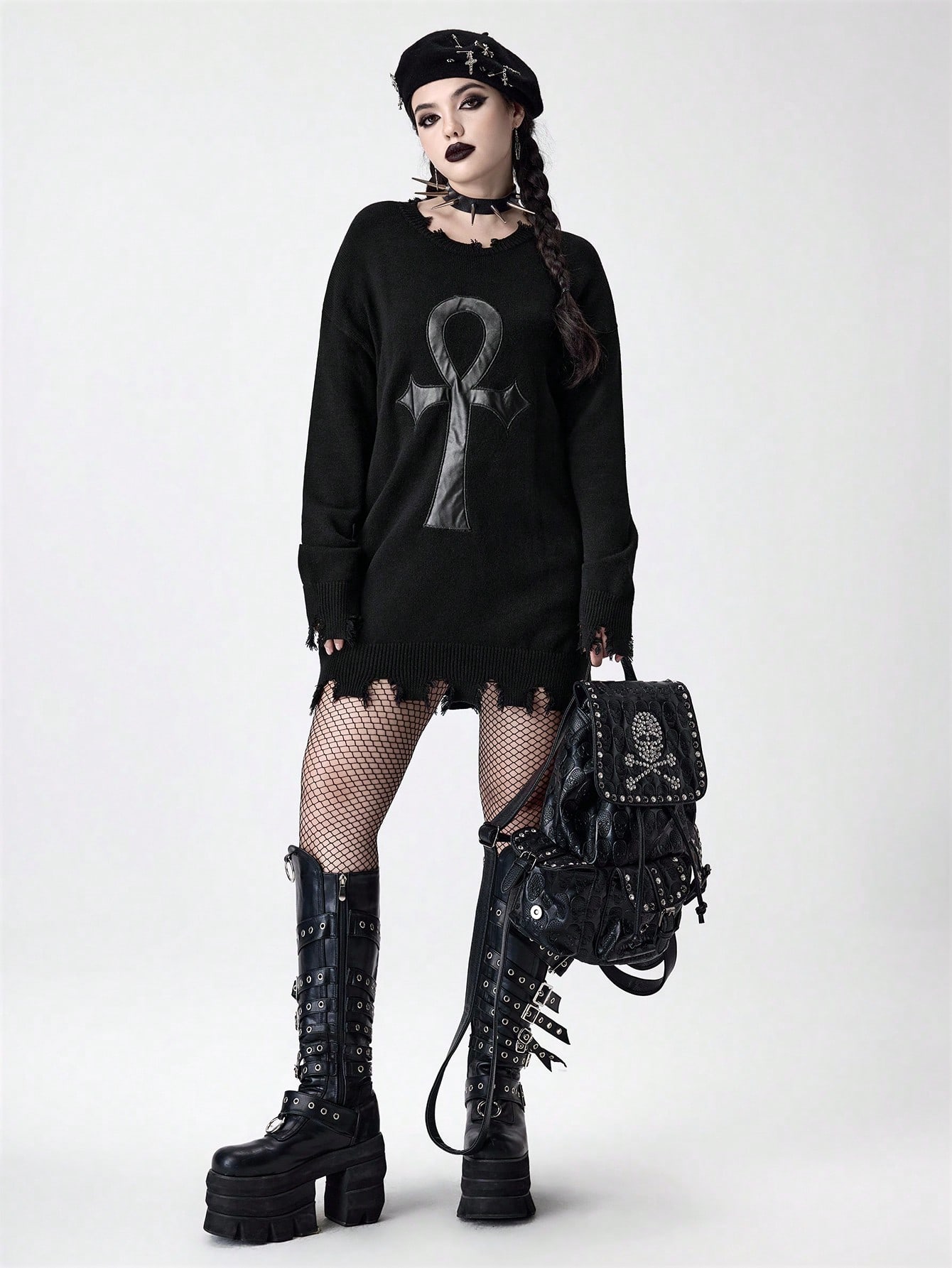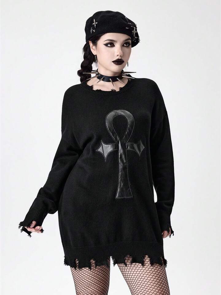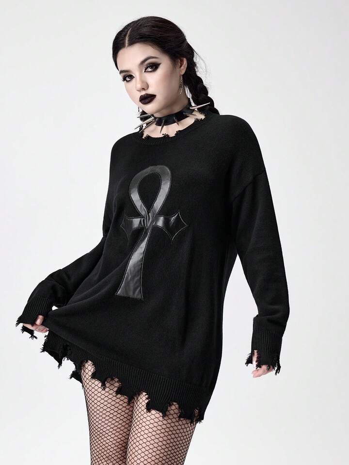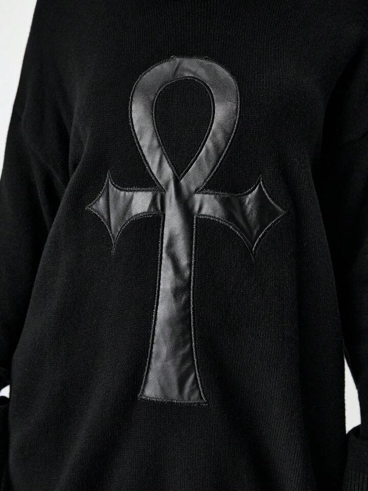 Suéter de mujer con diseño bordado y desgastado del símbolo gótico Ankh