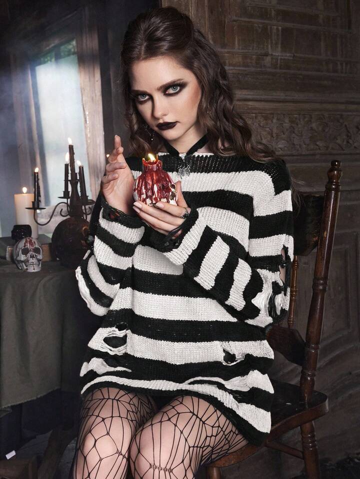 Goth Suéter de cuello redondo a rayas negras y blancas desgastado con estilo gótico