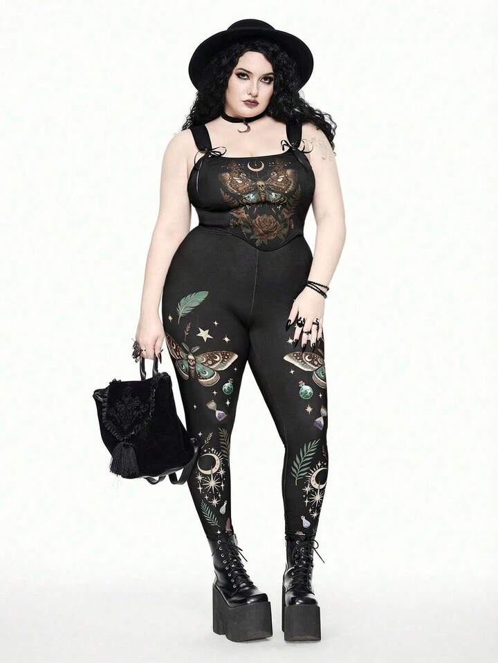 Goth Leggings negros con estampado de mariposa gótica, poción de estrella y luna, planta y pluma, de ajuste ceñido y talla grande para otoño/invierno