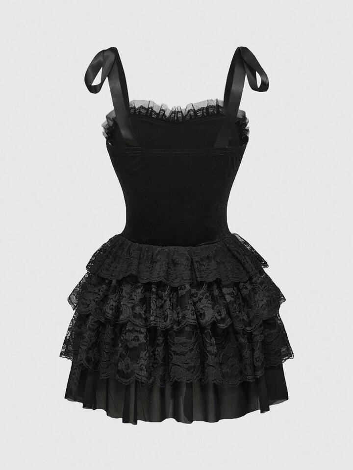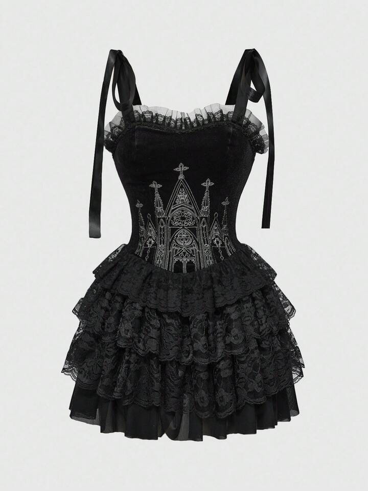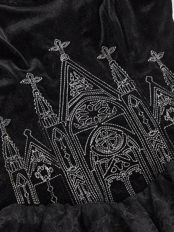 Goth Vestido de tirantes de terciopelo con bordado de cruz de castillo gótico, adorno de cruz y encaje de contraste, para Halloween