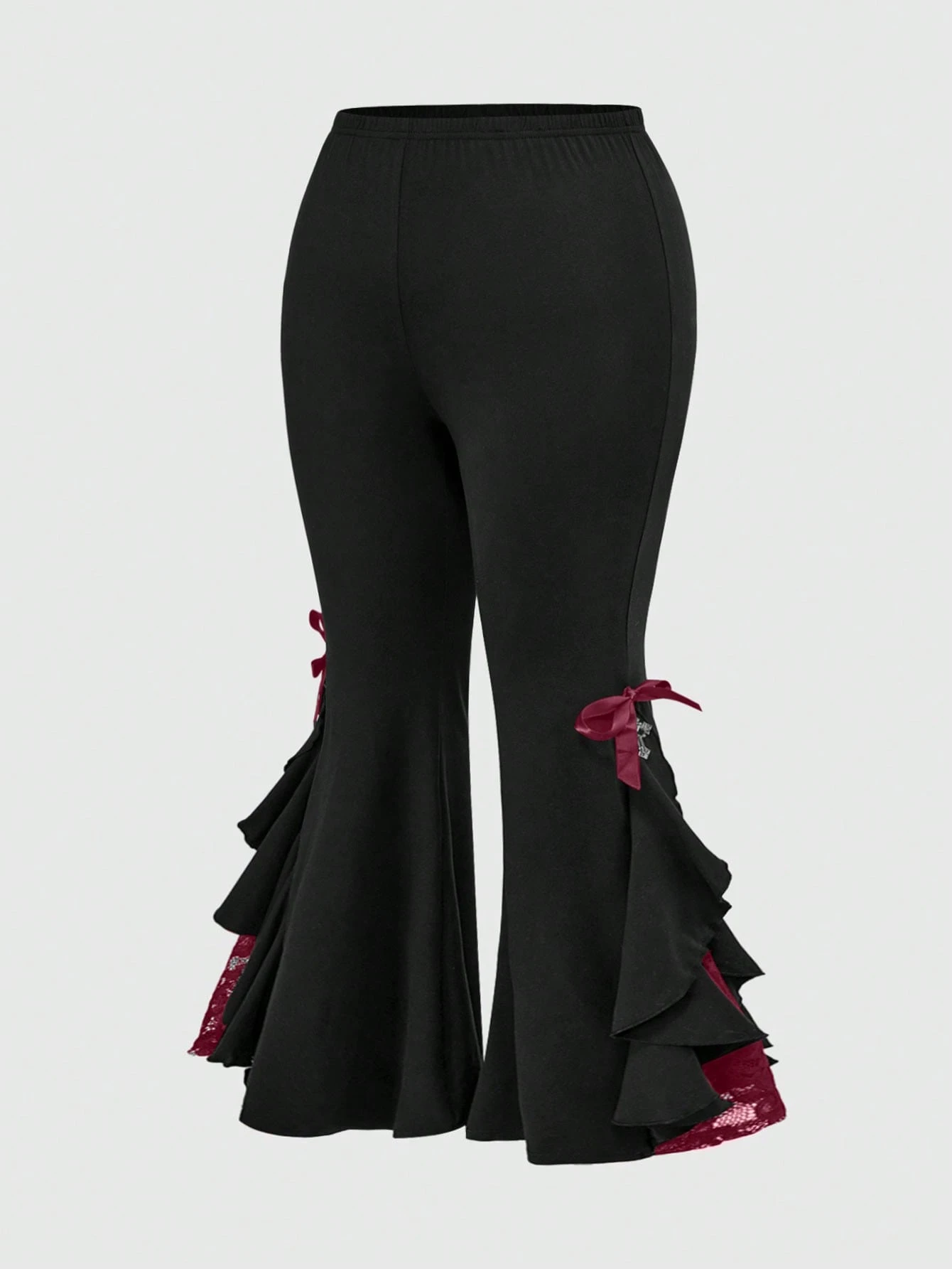 Goth Pantalones de campana con abertura alta, lazo de encaje en contraste y colgante cruzado gótico, talla grande