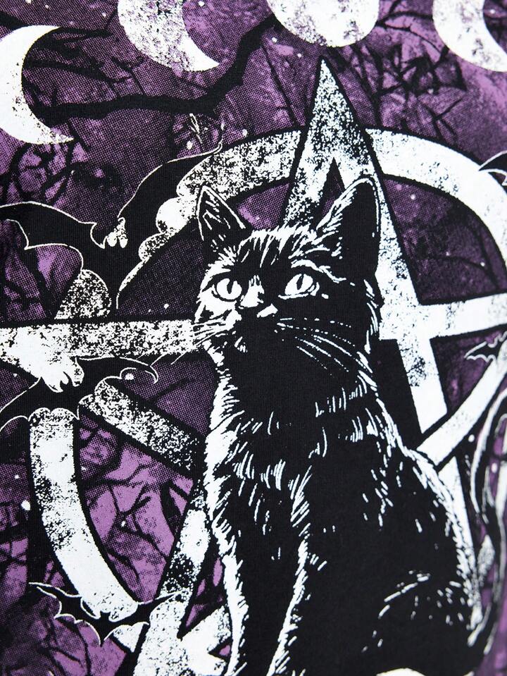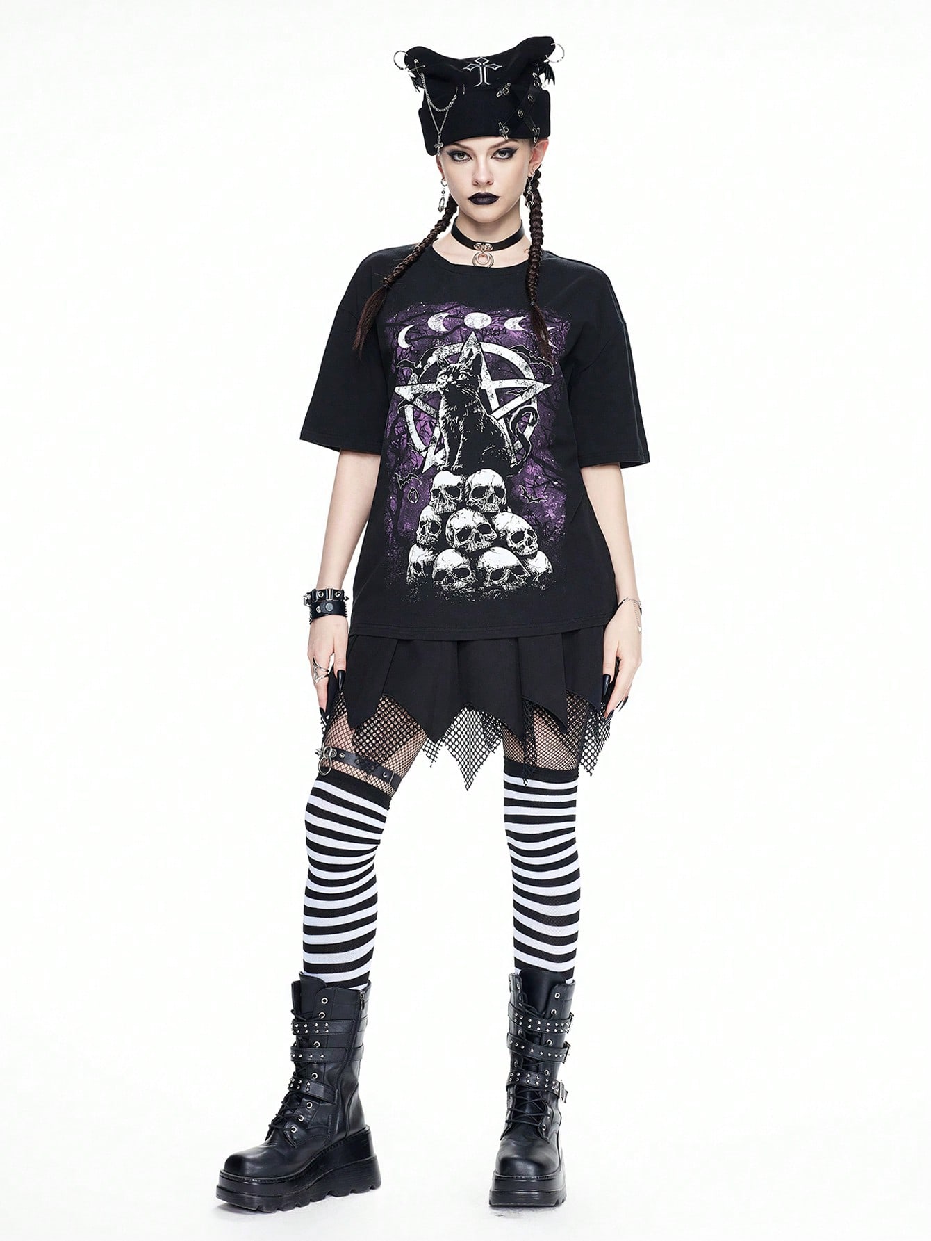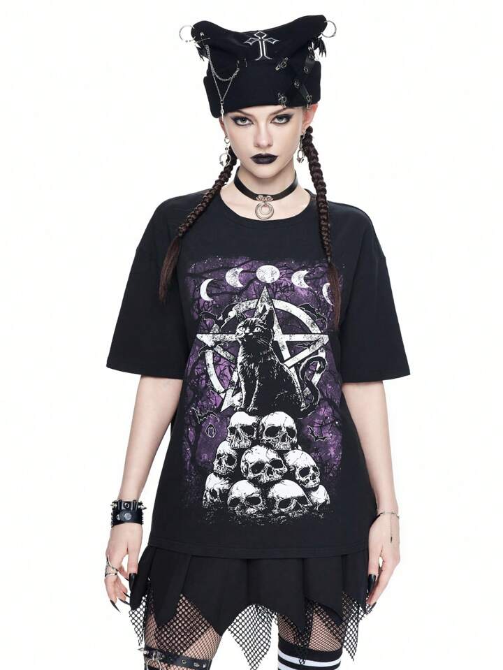 Goth Camiseta holgada de mujer con estampado de calavera de gato oscuro gótico