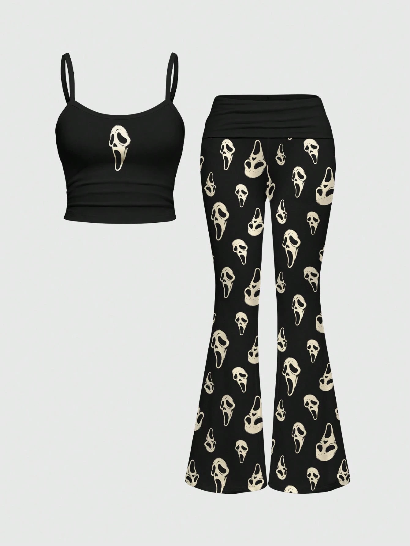 Goth Conjunto de 2 piezas para mujer con máscara facial oscura gótica, camiseta ajustada y pantalones acampanados de cintura baja fruncidos
