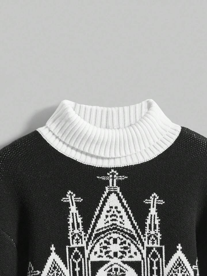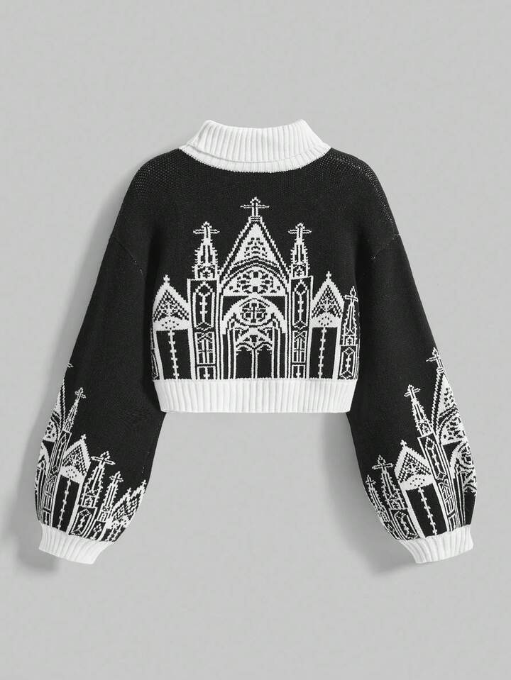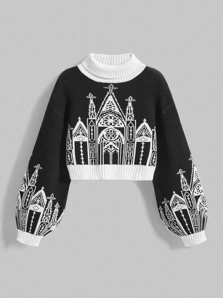 Goth Suéter de mujer de cuello alto, manga de linterna y diseño de castillo y cruz, estilo gótico oscuro de Halloween