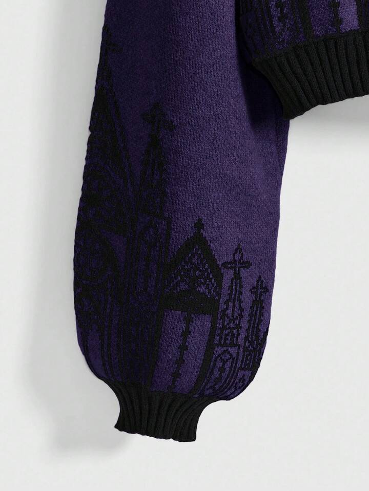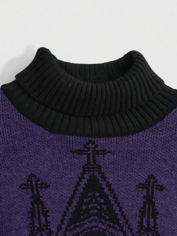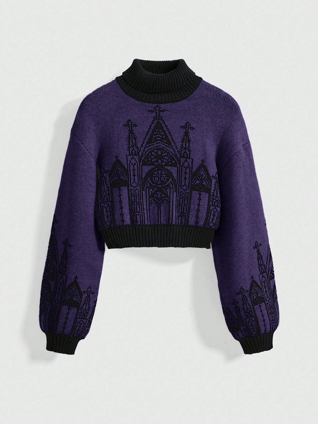 Goth Suéter de mujer de cuello alto, manga de linterna y diseño de castillo y cruz gótico y oscuro para Halloween