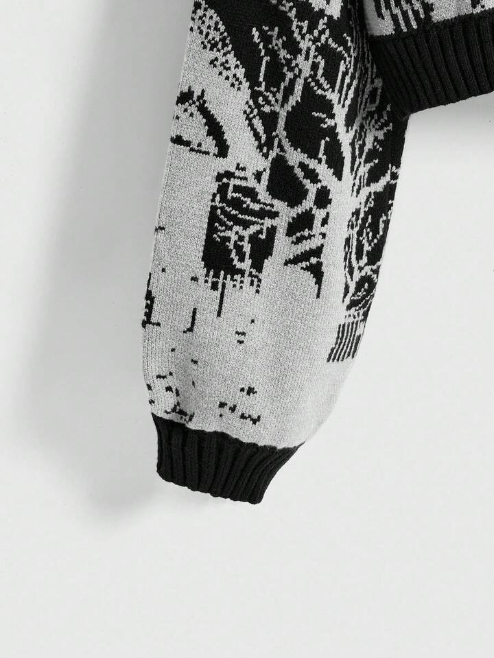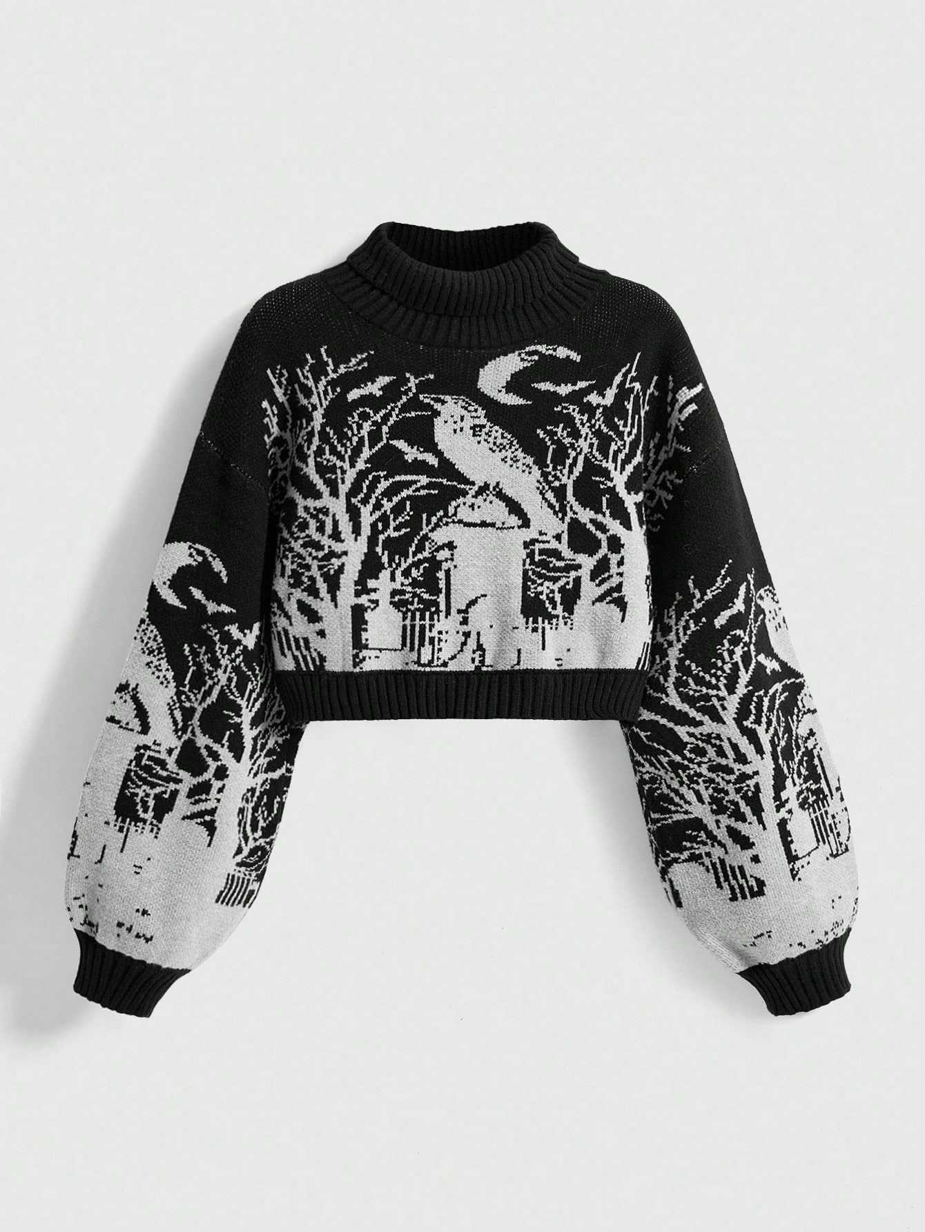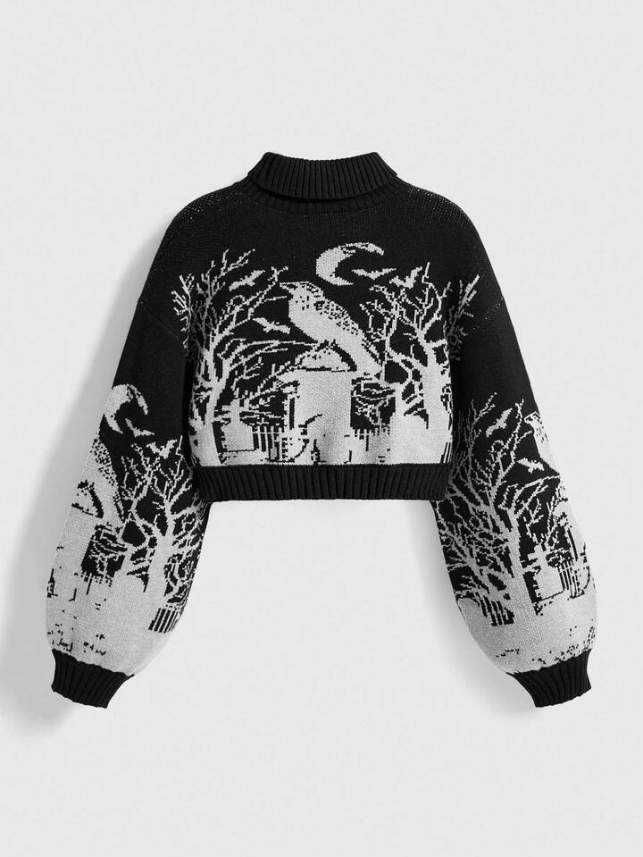 Goth Suéter de mujer de manga de linterna negra con estampado jacquard de luna, murciélago y rama de cementerio de cuervo de cuello alto y oscuro