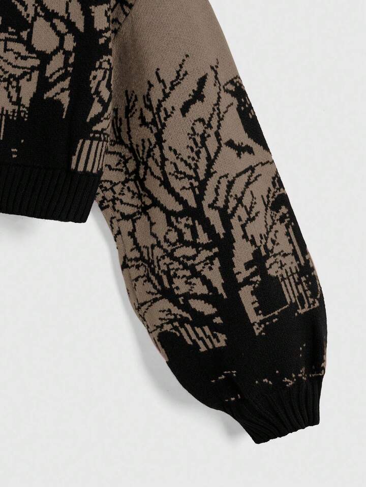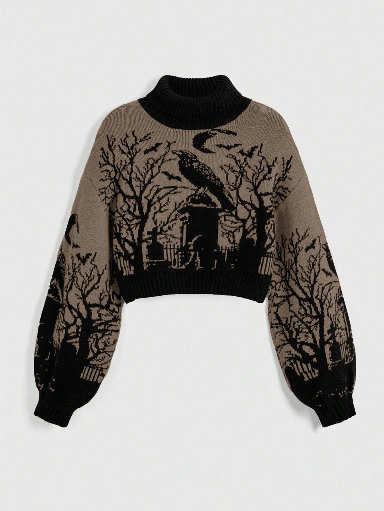 Goth Suéter de mujer de manga de linterna negra con estampado jacquard de luna, murciélago y rama de cementerio de cuervo de cuello alto y cálido de estilo gótico oscuro