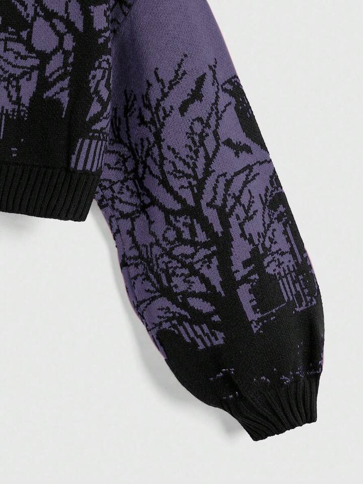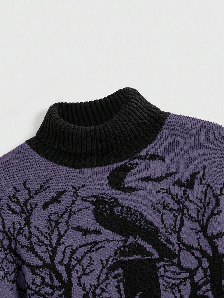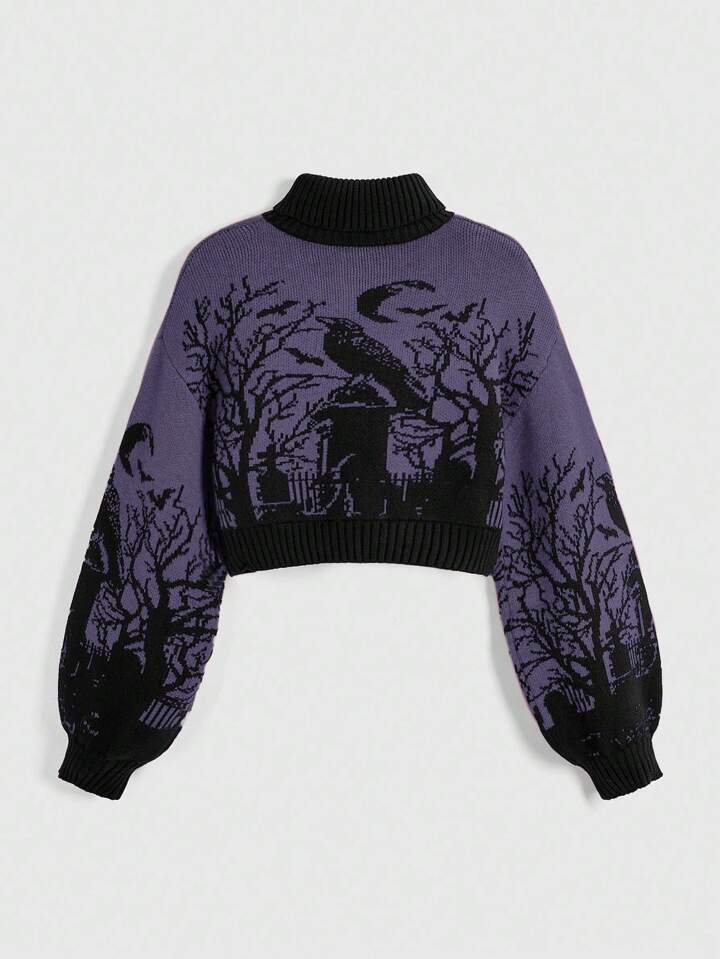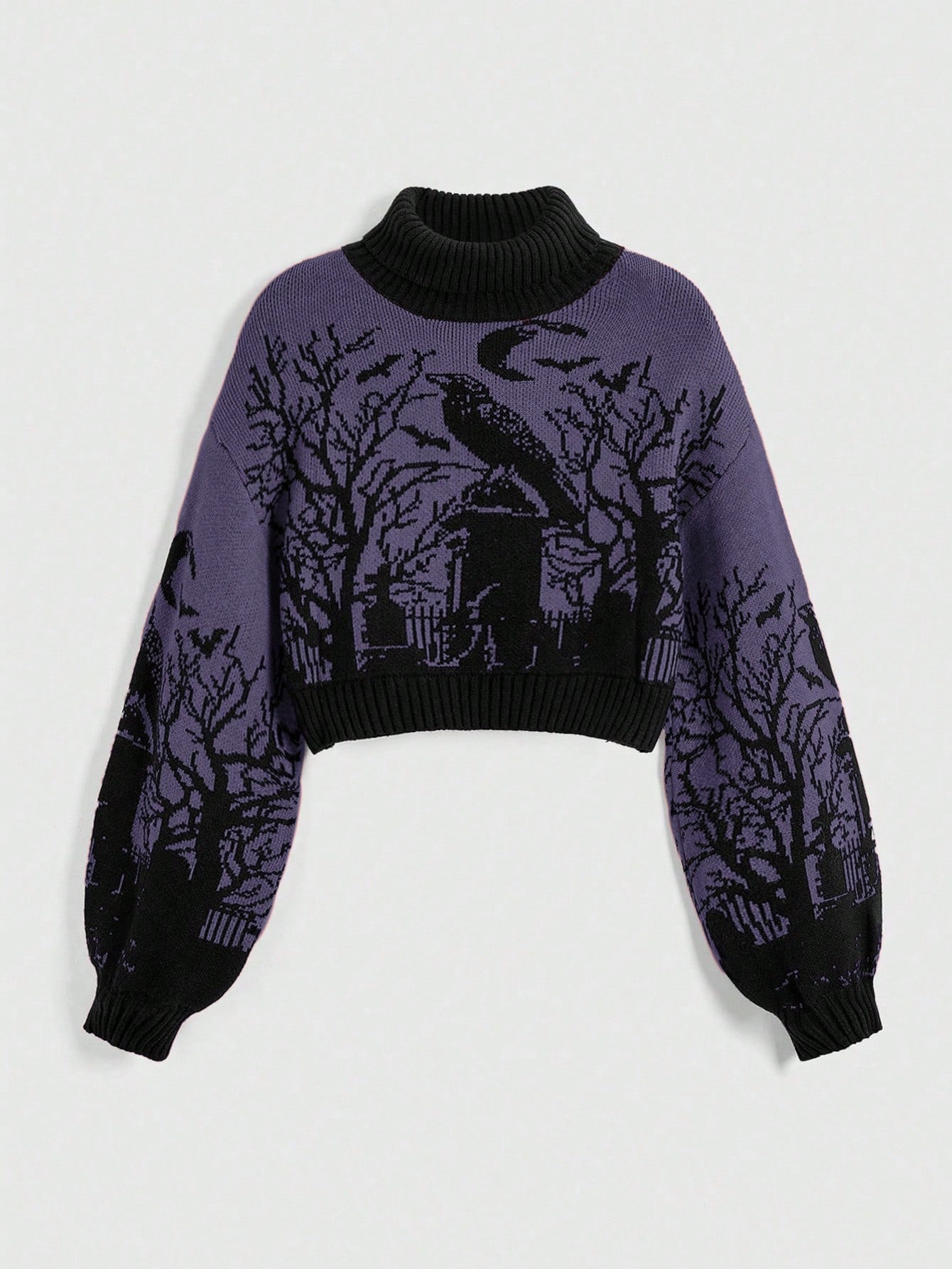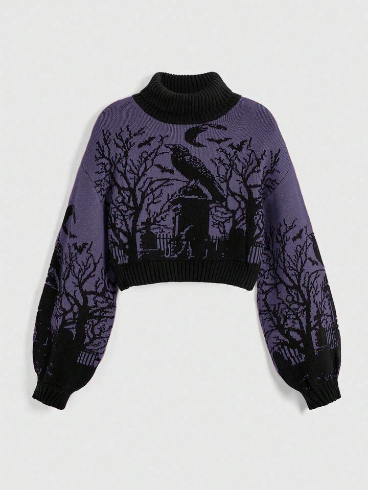 Goth Suéter de mujer con mangas de linterna, cuello alto, estampado de murciélago, rama y luna en el cementerio, de estilo gótico oscuro y cálido, para Halloween