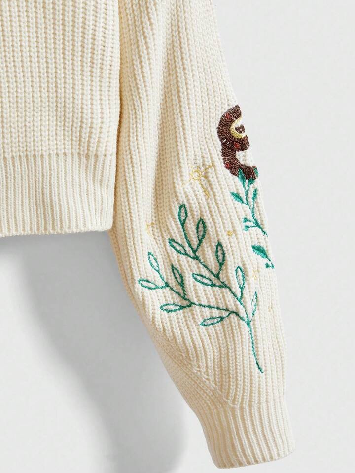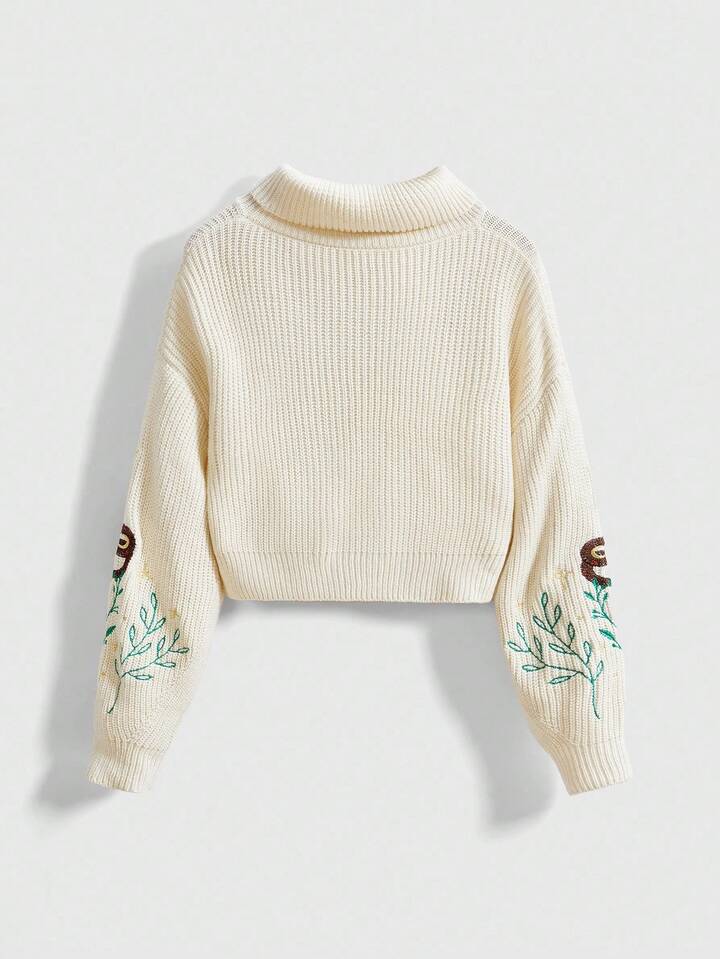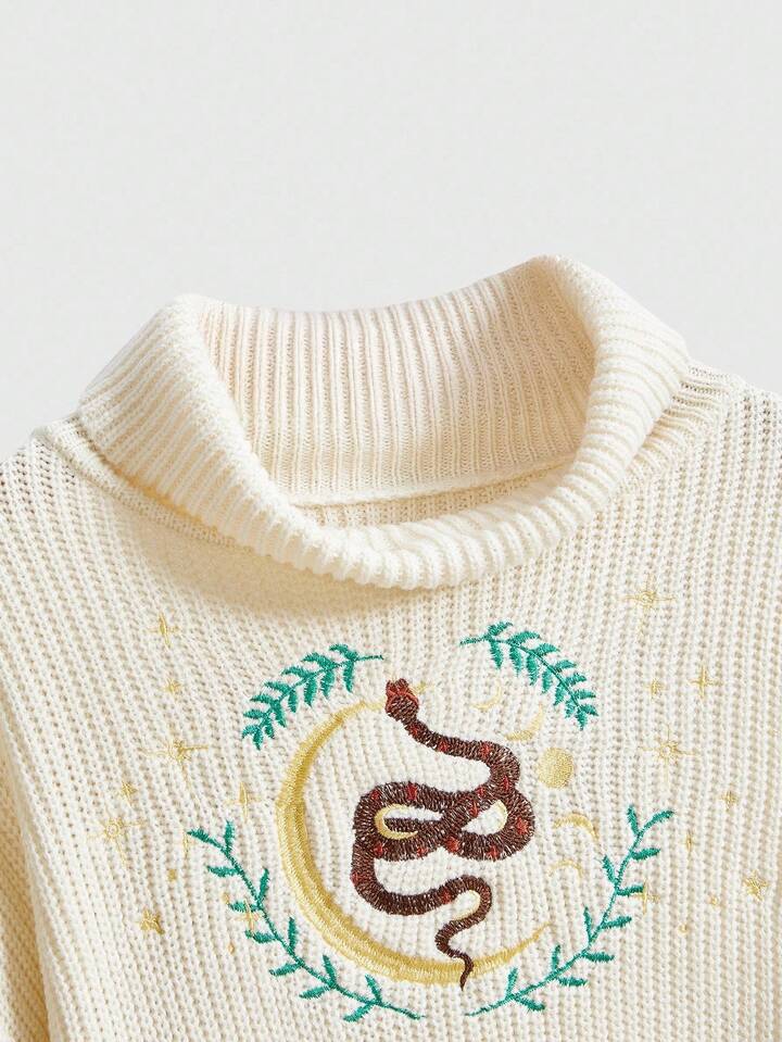 Goth Suéter holgado de cuello alto con bordado de planta y luna creciente, estilo gótico y misterioso para mujeres