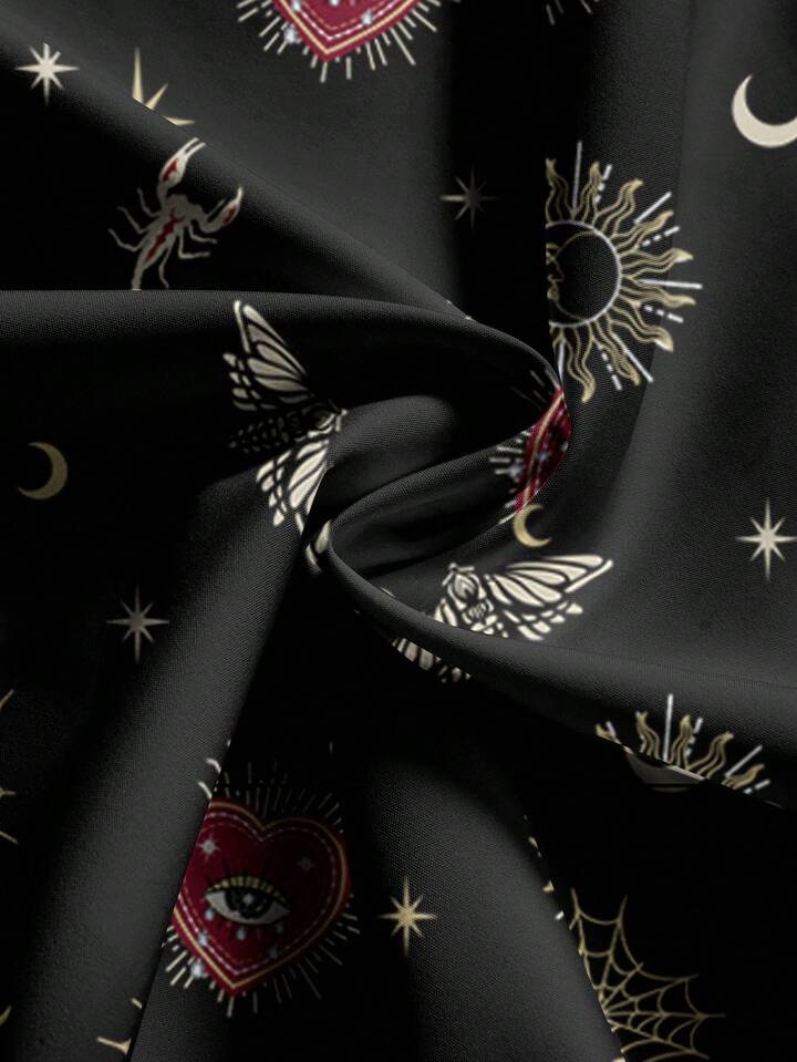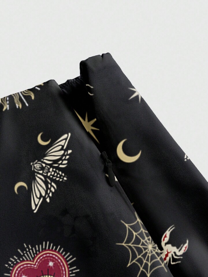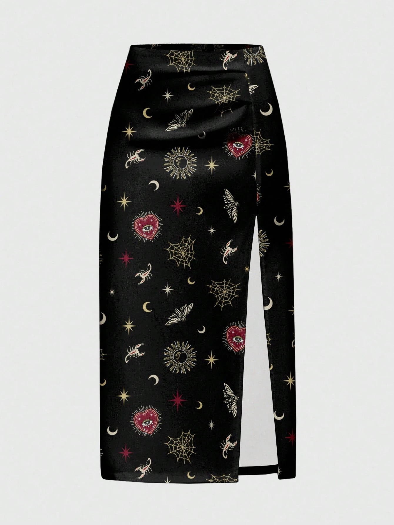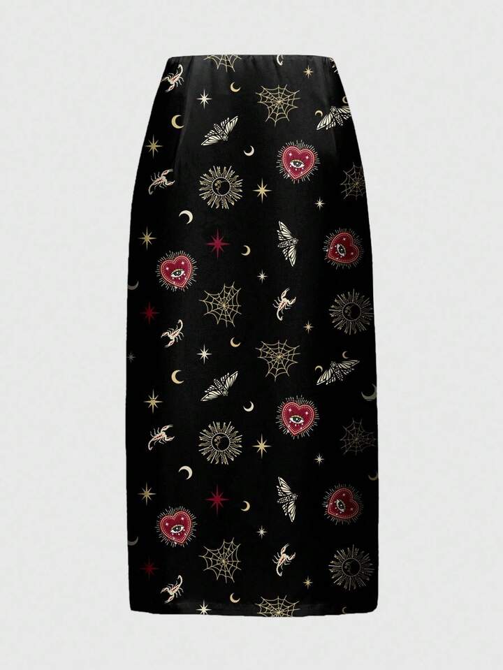 Goth Falda negra con abertura alta con estampado celestial de corazón, sol y luna para mujeres, estilo gótico palaciego oscuro