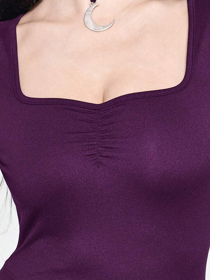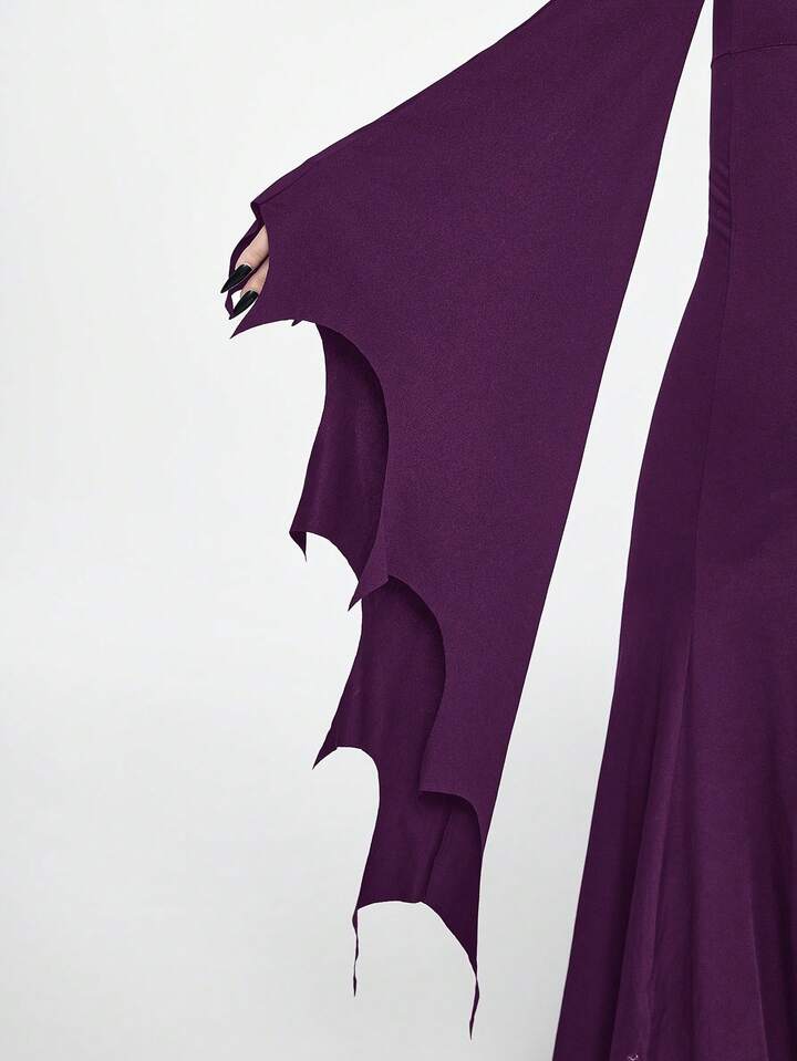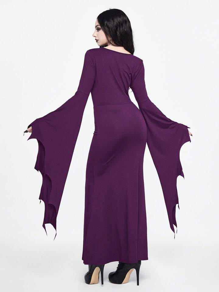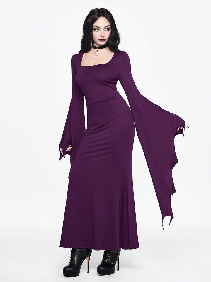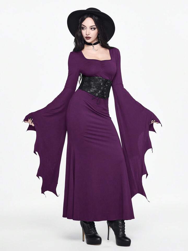 Goth Vestido negro de cuello cuadrado con cintura ceñida, mangas acampanadas asimétricas y estilo gótico oscuro para fiestas para mujeres
